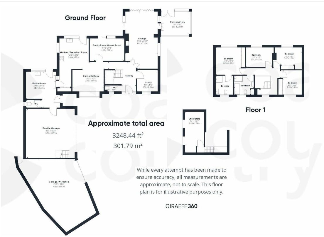 The entrance has a decorative glazed Veranda with tiled flooring and part decorative glazed entrance door with side panels leading into the reception hallway which has stairs to the first floor and opens into a dining hallway with bay window to front. There is a cloakroom/WC with low-level WC, wash basin and window. The lounge is triple aspect making it light and airy with double glazed windows to rear with patio doors leading to garden, feature fireplace with wood surround and inset open fire. Sliding doors lead to the conservatory with French doors leading to the garden. The second study has a window to front. The family room/guest bedroom has patio doors to the rear garden. The kitchen/breakfast room is extensively fitted with a range of wall and base units with rolled edge work surfaces and matching splashback, inset single drainer sink unit, built-in double oven and hob, concealed fridge/freezer, double glazed windows to side and rear overlooking the garden and door to outside, further glazed door to the utility room which is fitted with a range of base units with rolled edge work surfaces, matching splashback, single drainer sink unit, space for appliances, wall mounted gas boiler, and door to garden, further door to front and courtesy door to the double garage. Off the utility room there is a cloakroom/WC with low level WC and window.
