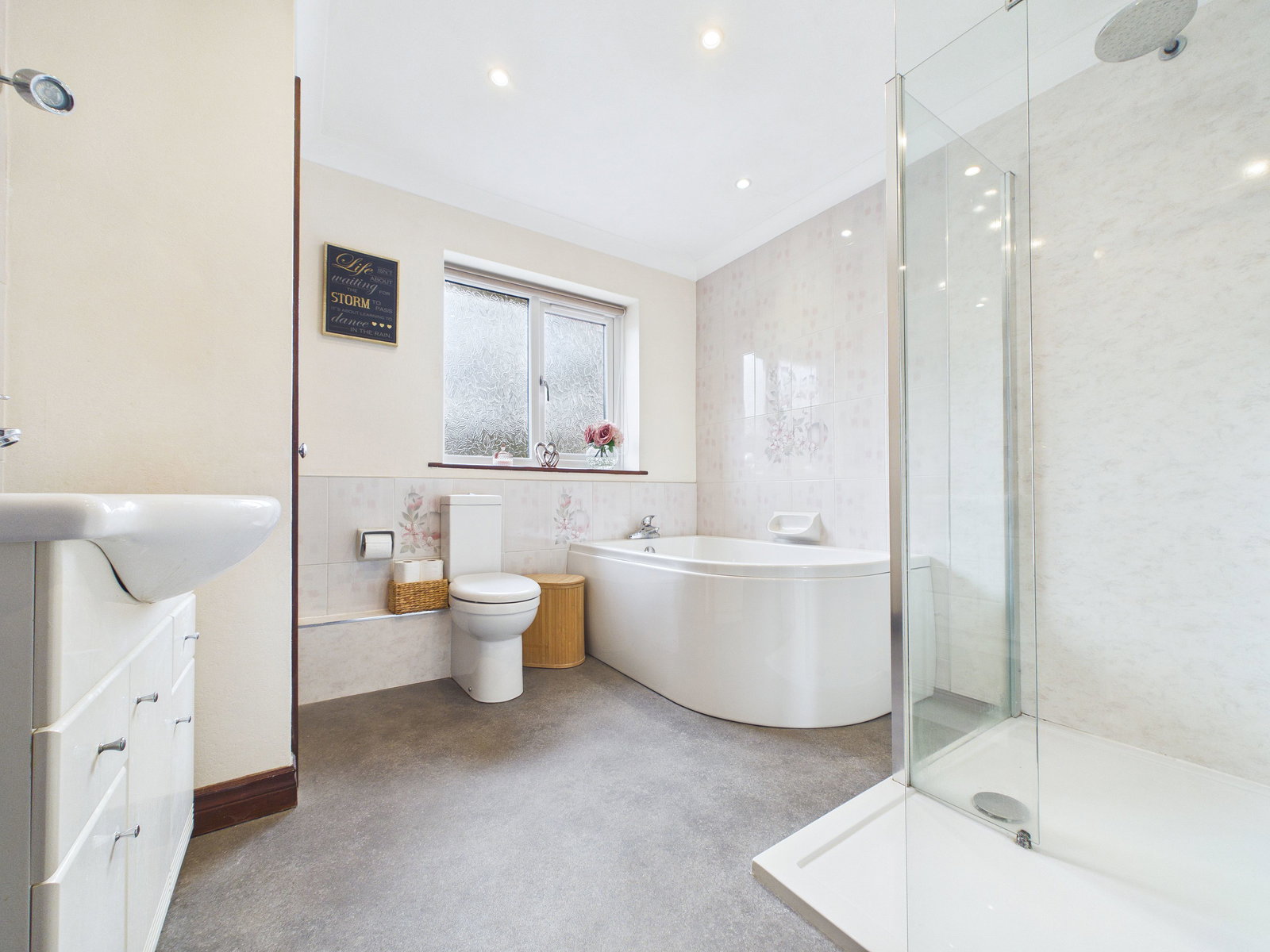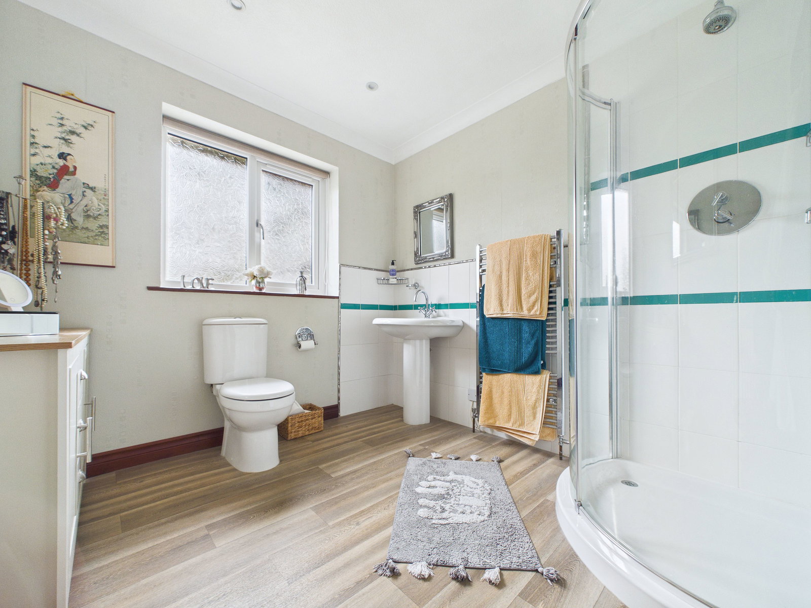 To the first floor is a galleried landing with large display, window to front and access to a loft. Bedroom one has a range of built-in wardrobes and window overlooking the garden and an en-suite shower room comprising corner shower cubicle, low level WC, pedestal wash basin and obscure glazed window. Bedroom two has a mirror-fronted wardrobe and, along with bedroom three, both have double glazed windows overlooking the rear garden. Bedroom four has a window to front and fitted wardrobes. The family bathroom has a suite comprising panelled bath, separate shower cubicle, low level WC and pedestal wash basin.