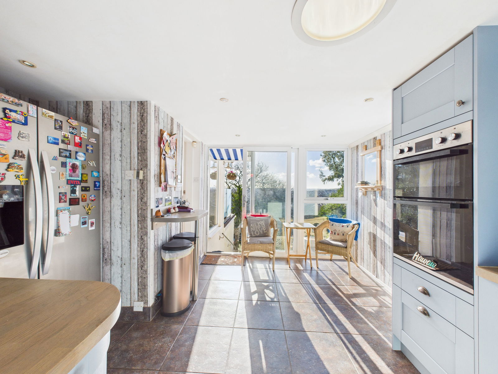 KITCHEN Fitted wall and base units with work surfaces, integrated double oven and dishwasher, four-ring gas hob, space for American-style fridge/freezer, stainless steel sink, power points. Windows to front and rear with sliding door to garden. Door to:-