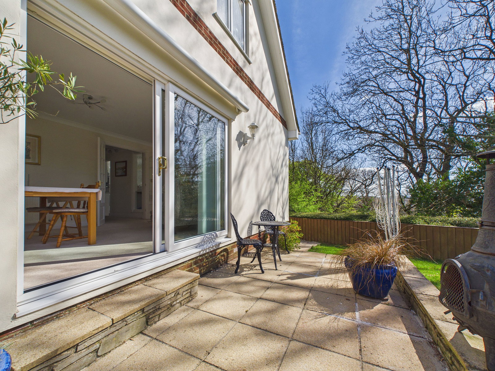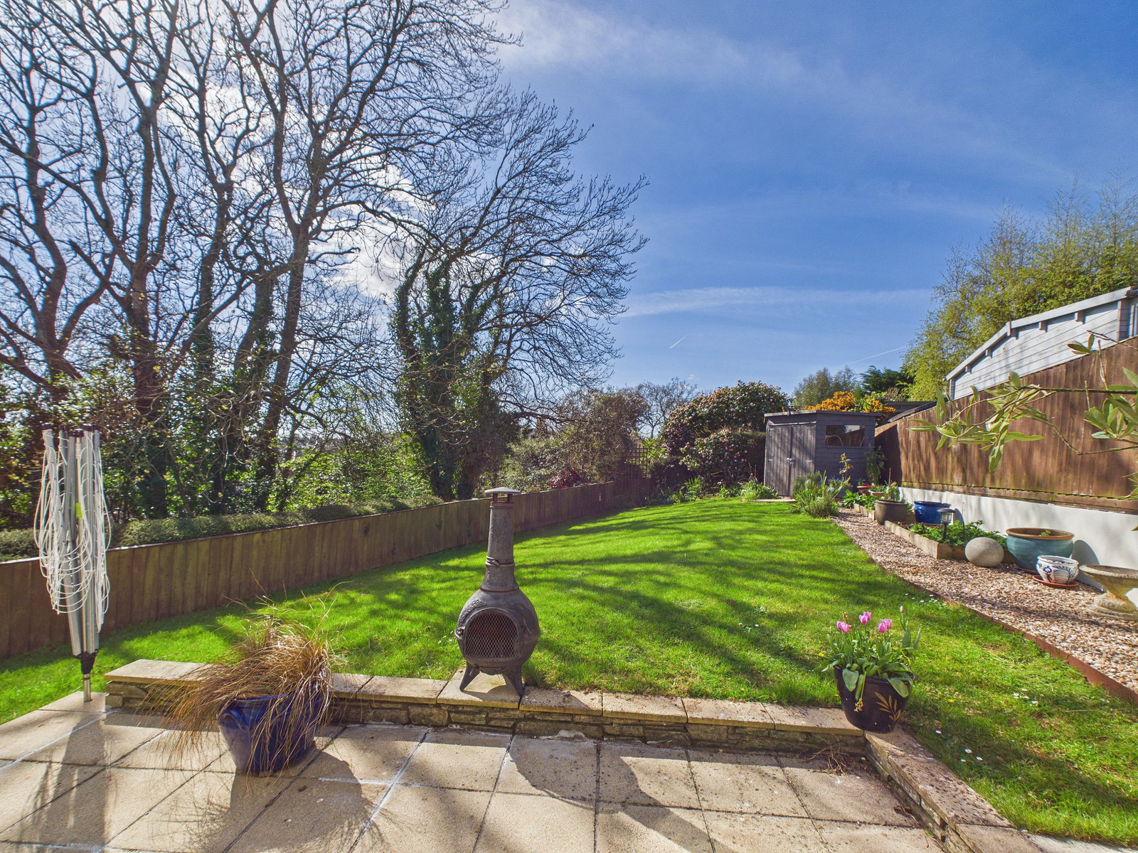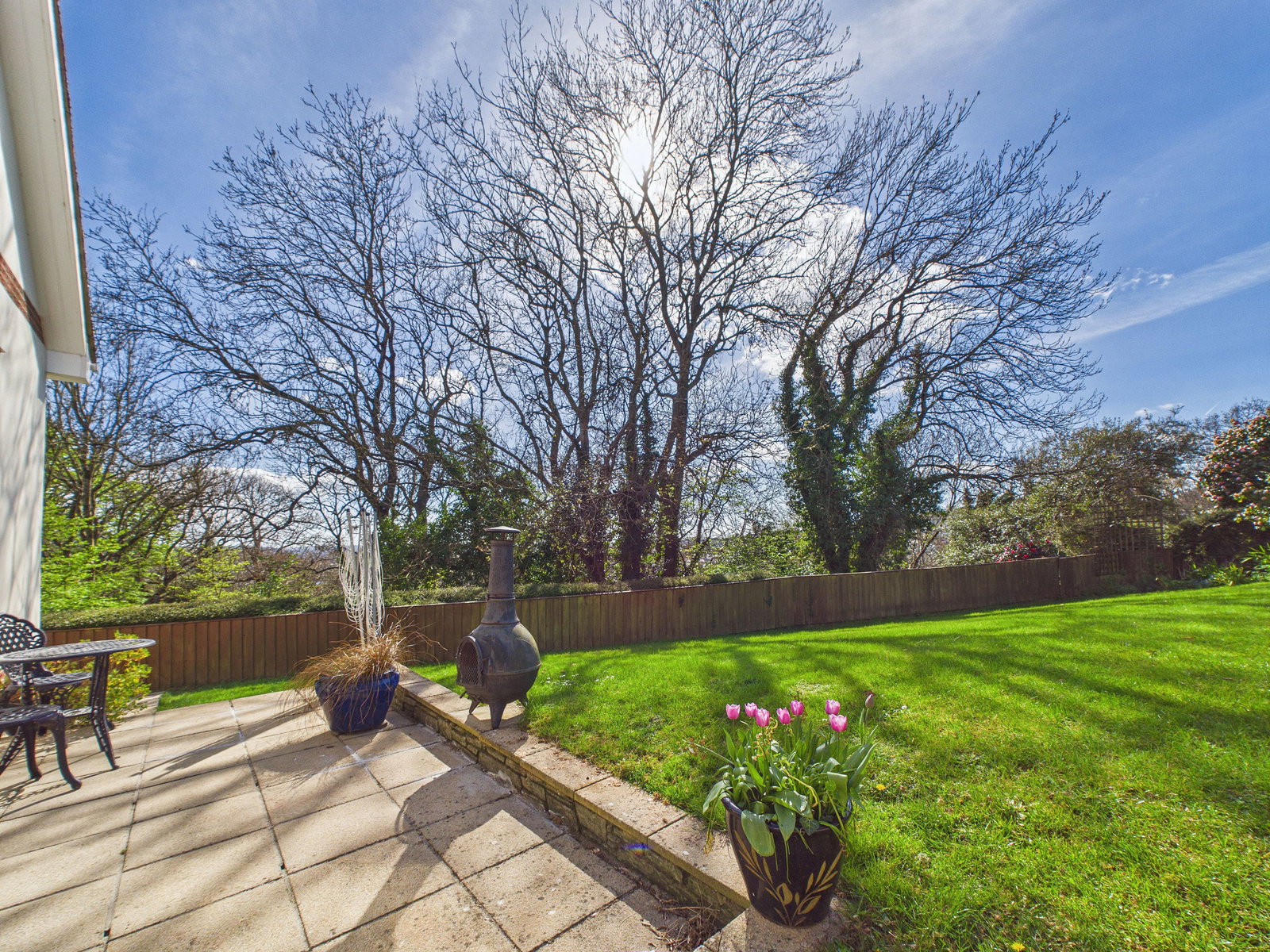A private and south-facing rear garden, not overlooked and backing onto woodland, offering a peaceful and secluded environment. The garden is mostly laid to lawn with planting beds and a suitable storage shed. A patio area extends from the lounge, creating an ideal outdoor seating space. Additionally, a newly fitted composite decking area accessed from the kitchen provides a private suntrap, benefiting from all-day sun.