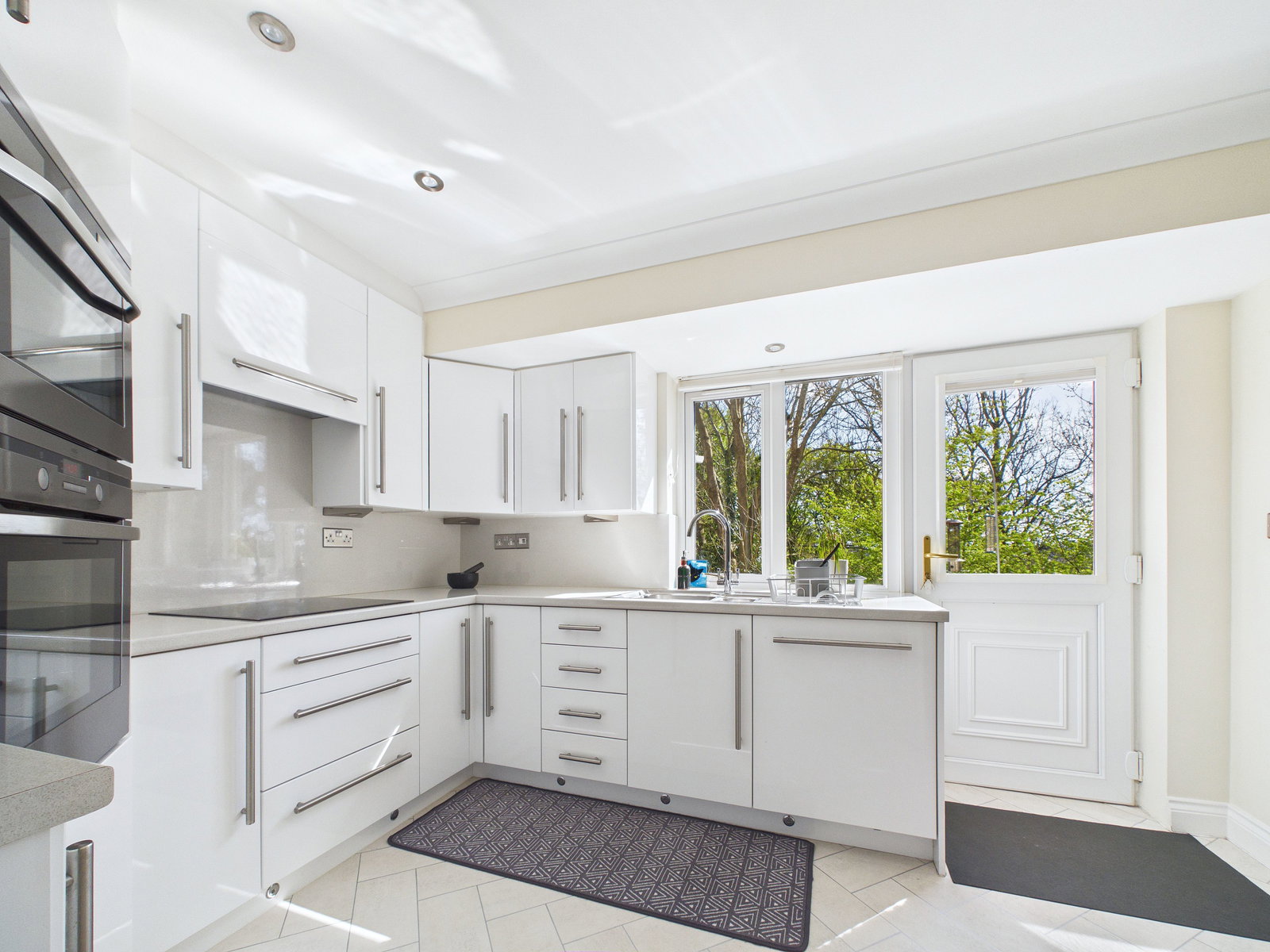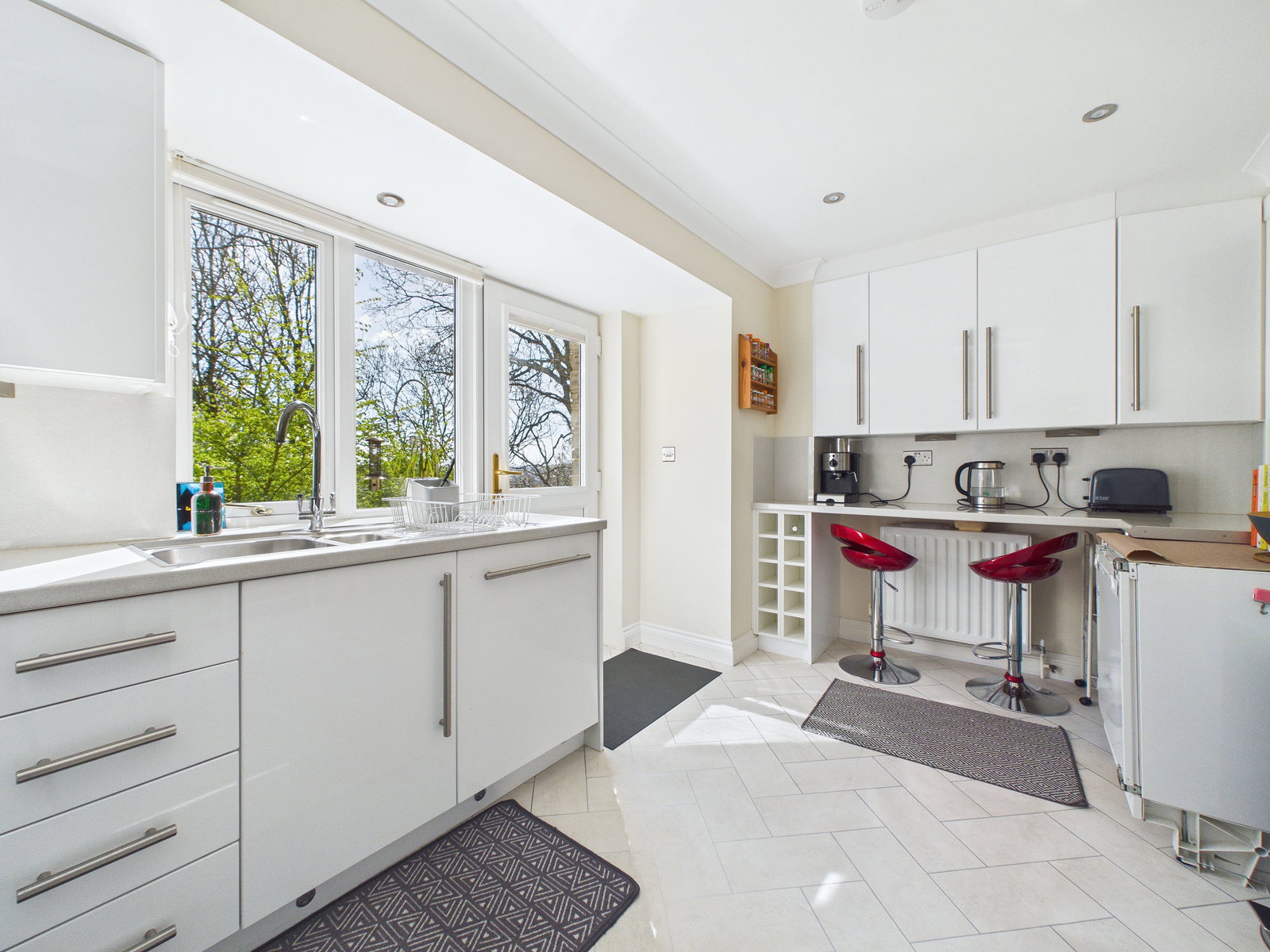 A light and spacious kitchen fitted with a range of built-in appliances including dishwasher, microwave, electric oven, extractor and induction hob. Additional features include space for a fridge freezer, a small breakfast bar, radiator, and UPVC double glazed window overlooking the rear woodland. A UPVC door leads directly onto the composite decking area.