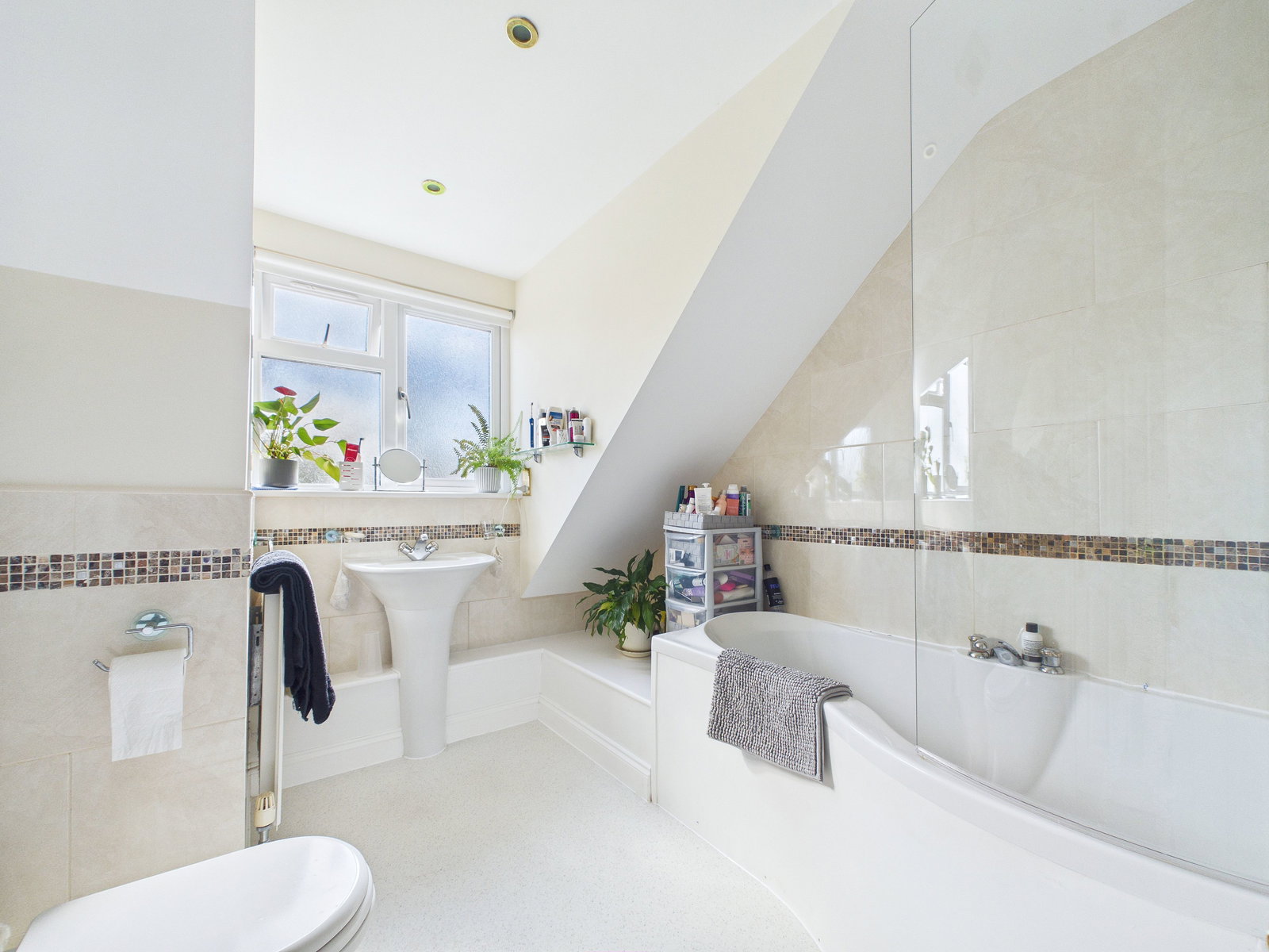 A Jack and Jill bathroom fitted with a bath and overhead shower, vanity wash basin, WC, radiator and tiled walls. Includes a frosted UPVC double glazed window.