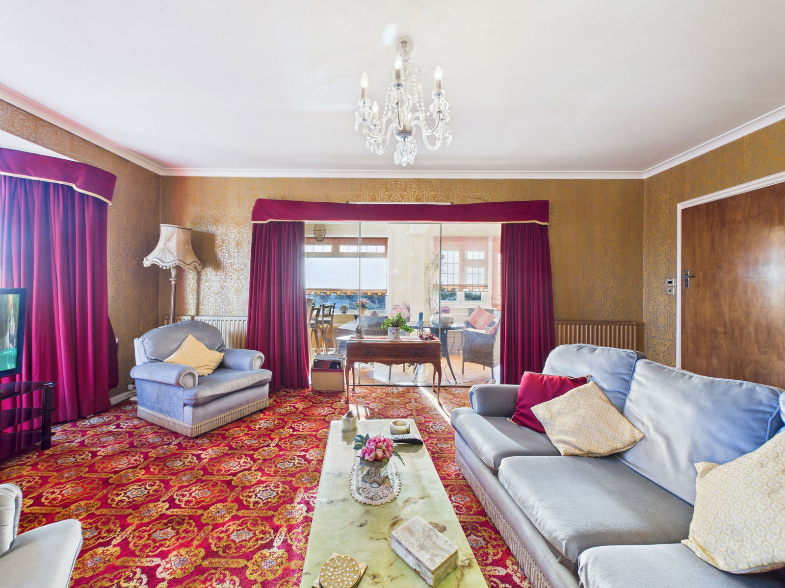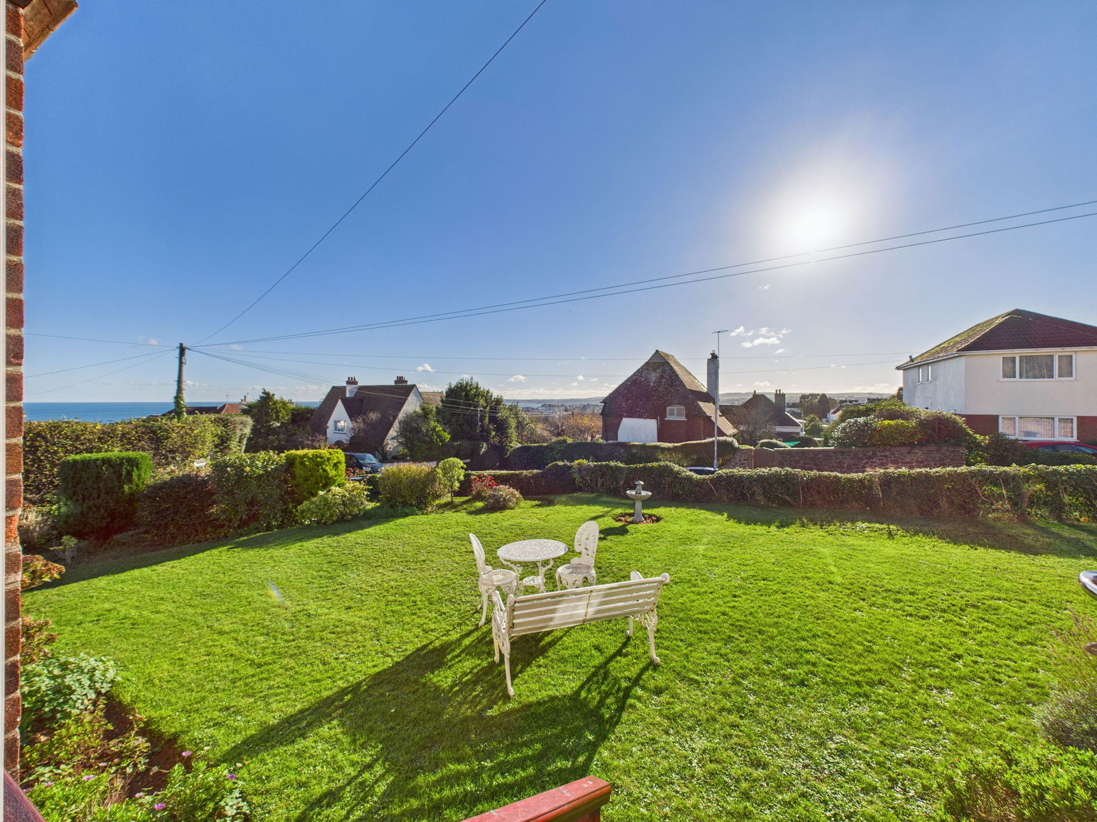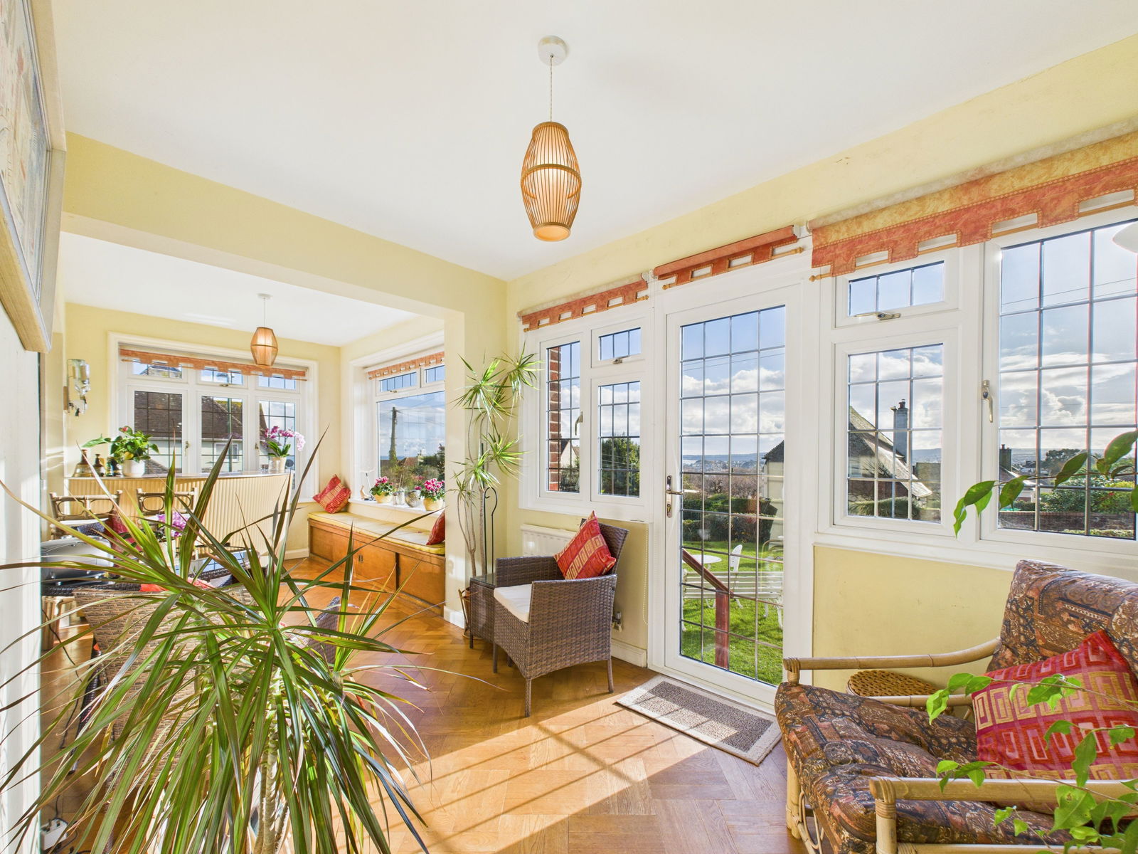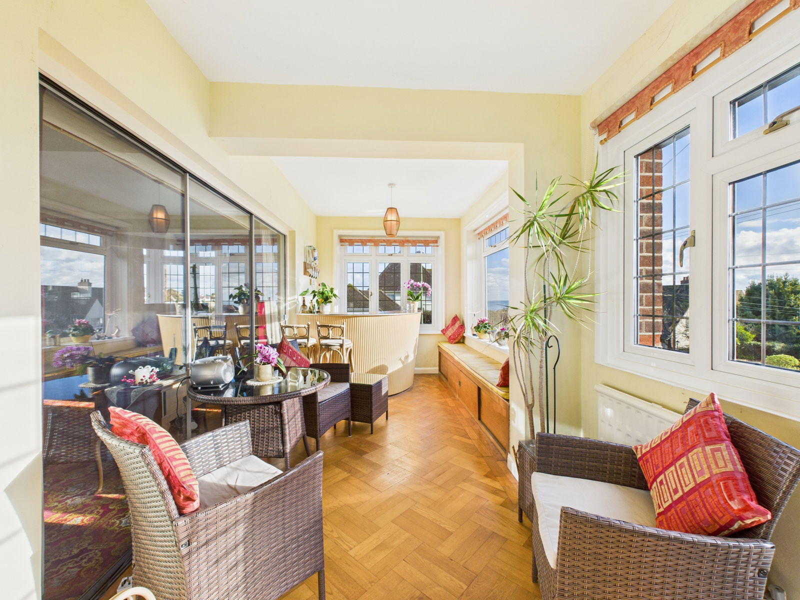 SUN ROOM Central heating radiator. Good sea views, uPVC windows and doors onto gardens. Wonderful views across the bay from the large panoramic window.