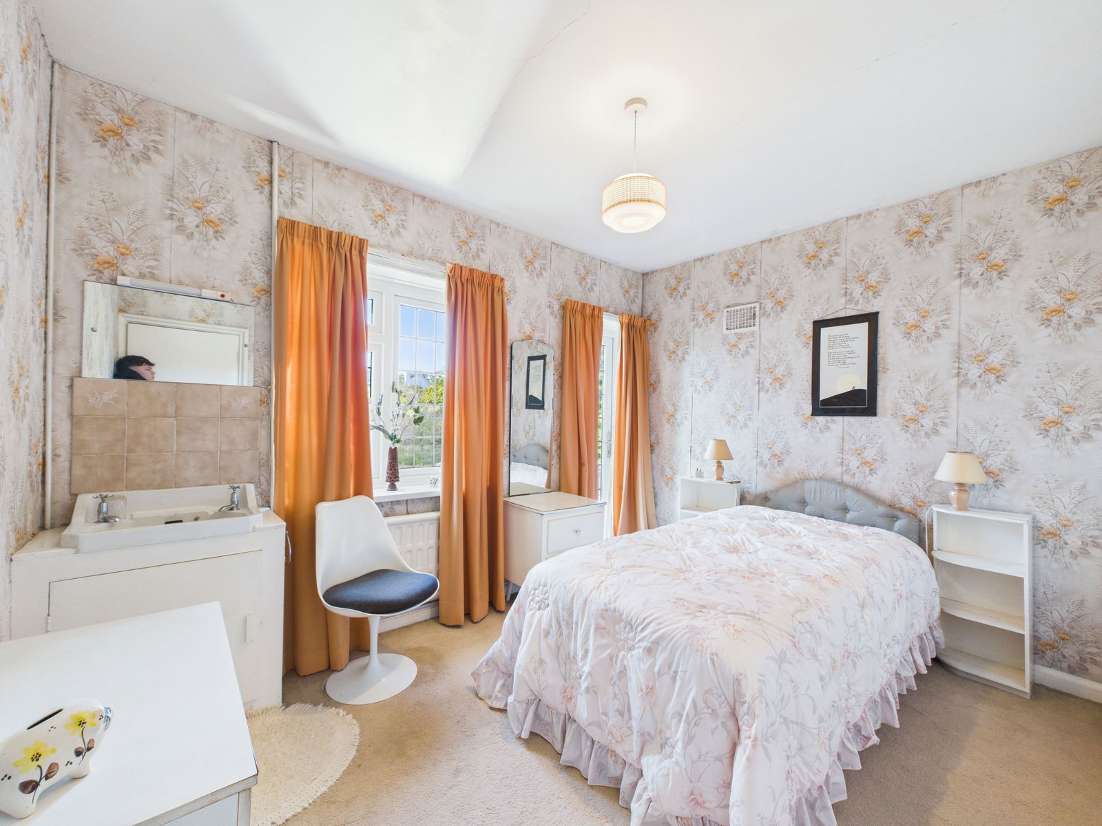 BATHROOM Most attractive 1930's bathroom suite with central bath with inset taps, shower, pedestal wash basin, half tiled, chrome heated towel rail and uPVC double glazing.