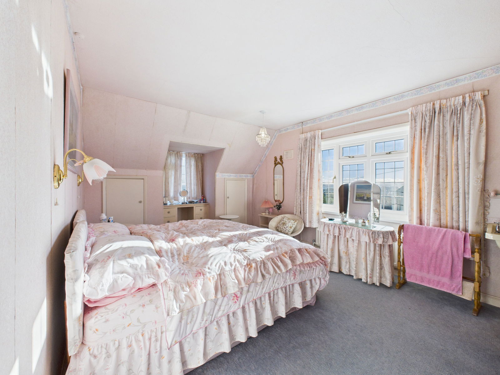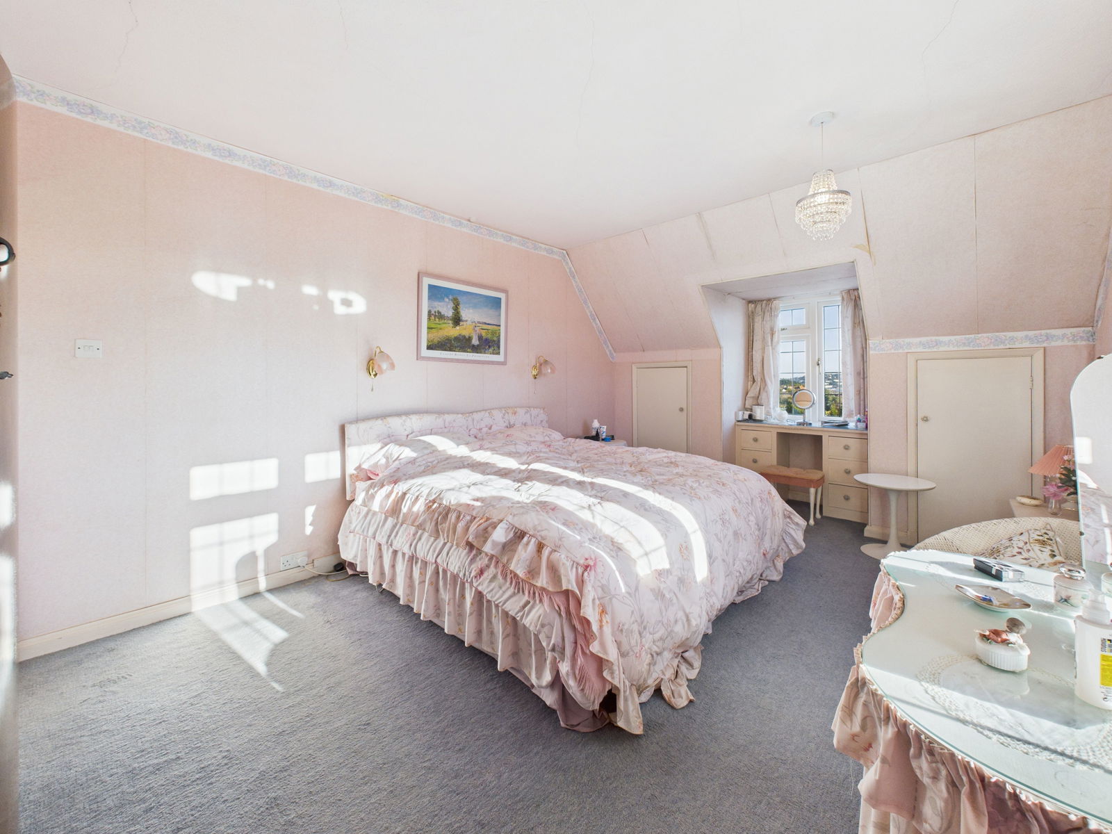 BEDROOM TWO Double aspect room again taking in beautiful sea and town views. Central heating radiator. Pedestal wash basin, eaves storage and built in vanity desk.