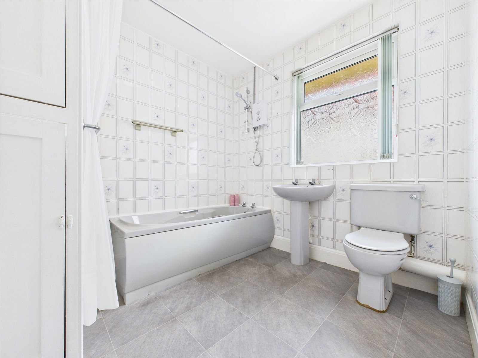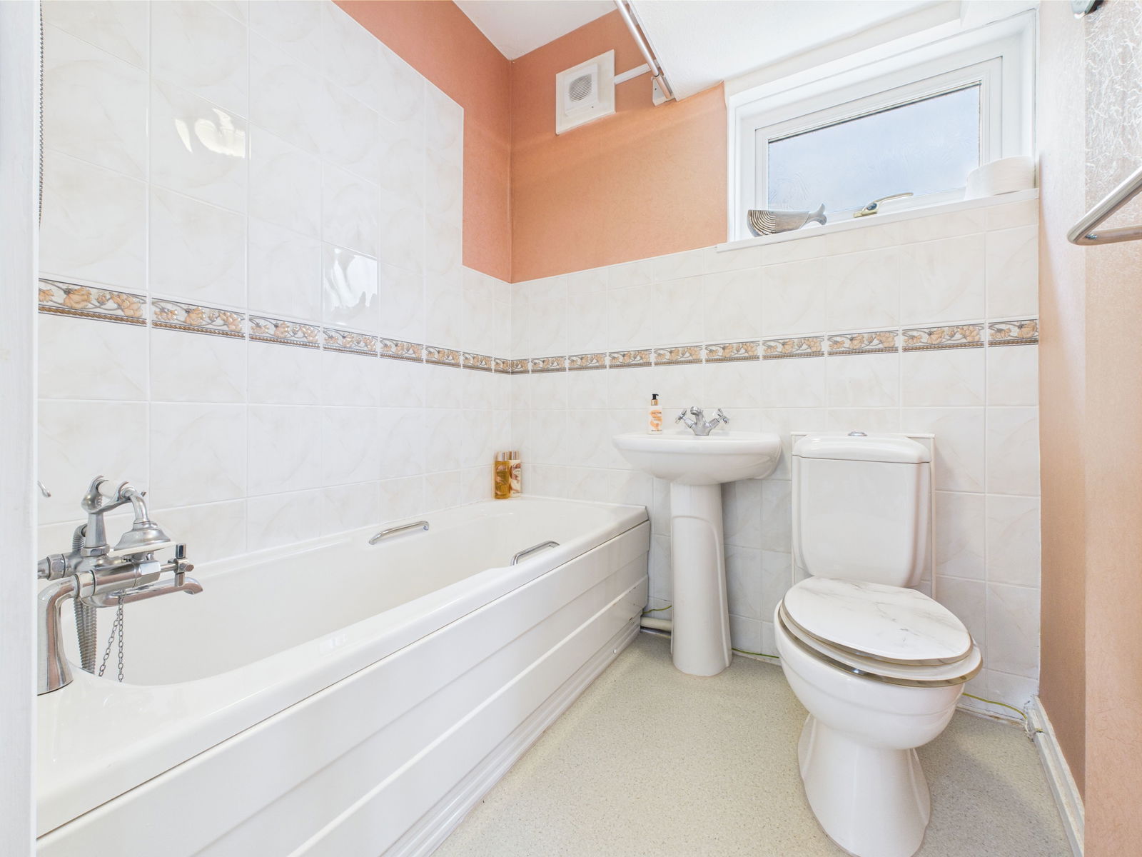 GROUND FLOOR BATHROOM/WC - 5' 6" x 5' 5" (1.68m x 1.65m) Comprising panelled bath with twin hand grips and shower attachment over, electric shower, pedestal wash hand basin, close coupled WC, part tiled walls, wall mounted electric fan heater.