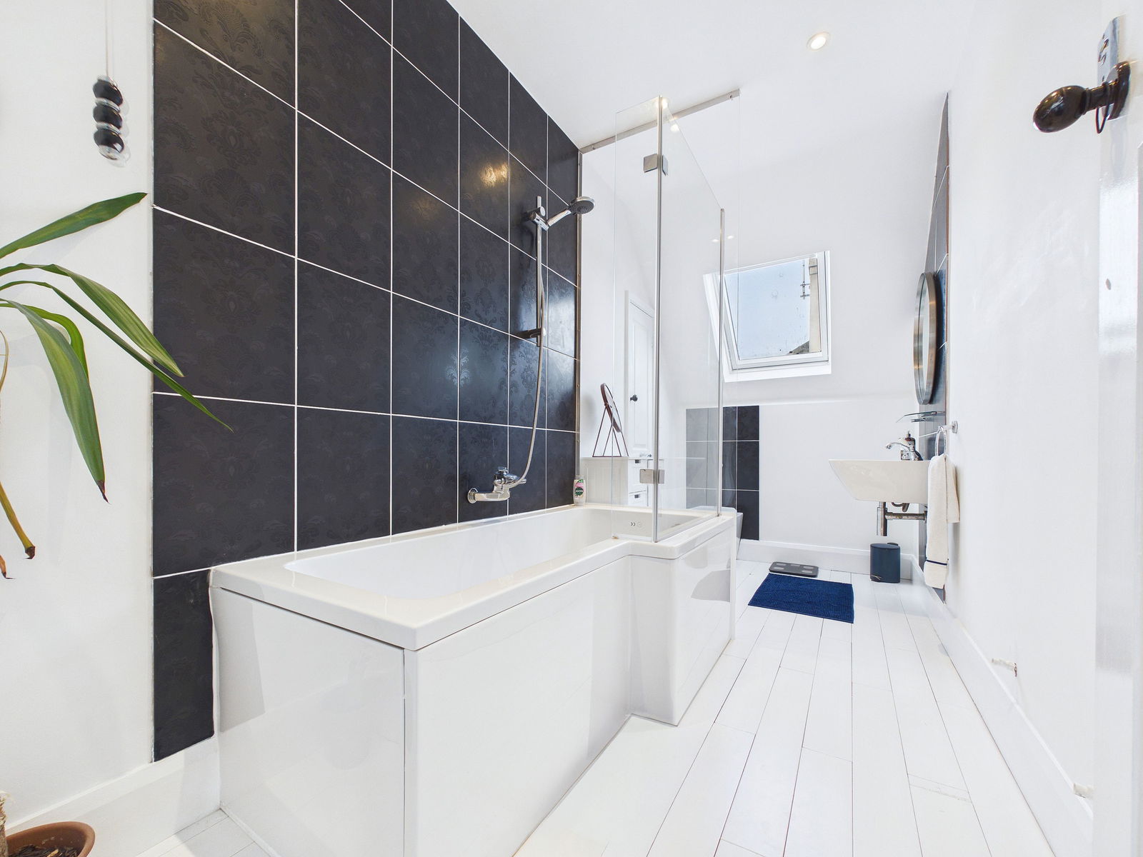 FAMILY BATHROOM Luxury suite comprising shower bath with glass screen and shower attachment, vanity basin, close coupled WC and part tiled. Store cupboard with gas combi boiler.