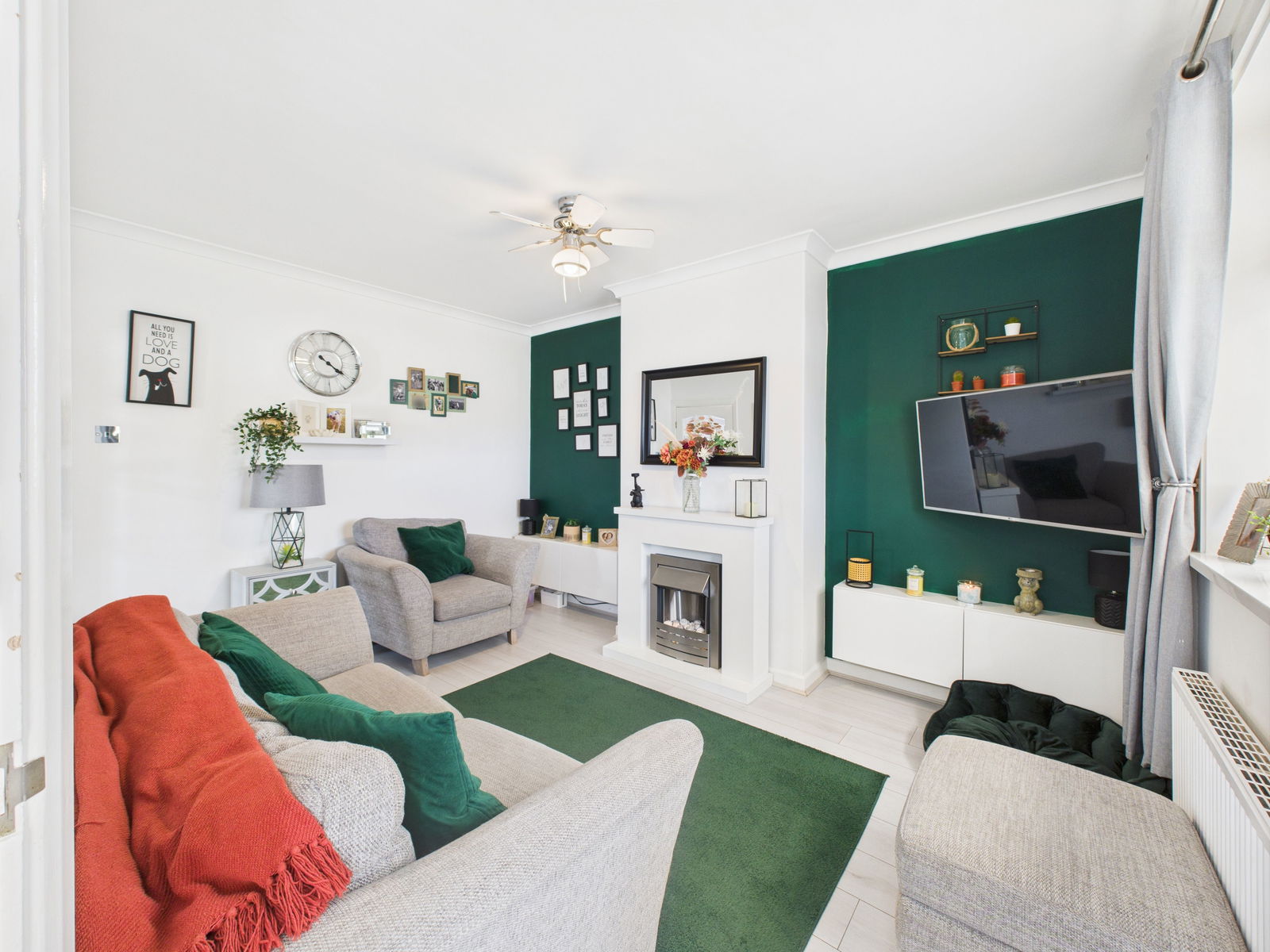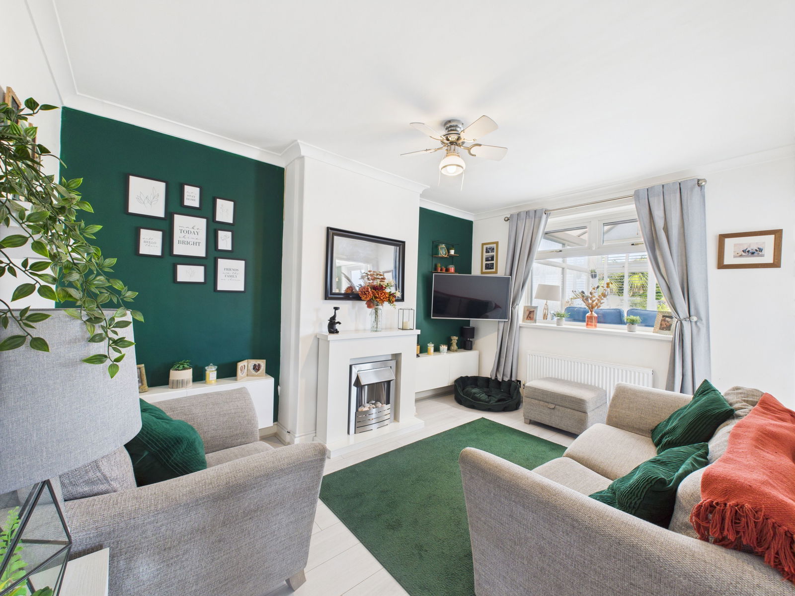 LOUNGE An inviting and generously sized living room, featuring a charming gas fireplace, a uPVC double glazed window floods the space with light and a TV point and gas central heated radiator.