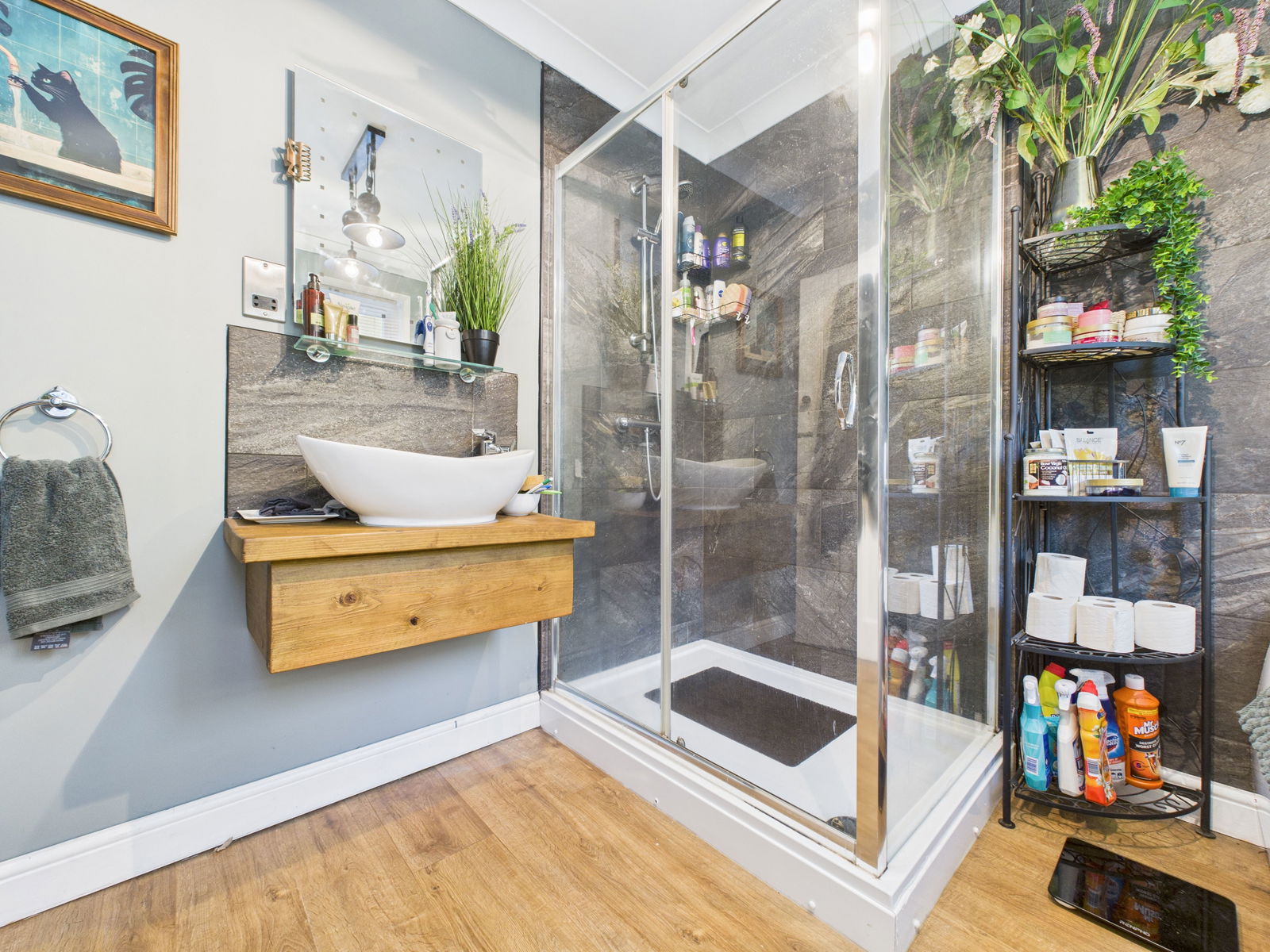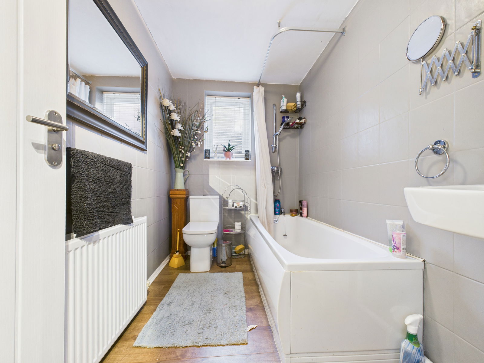 BATHROOM A luxurious four-piece suite including a panelled Jacuzzi bath, vanity unit with freestanding basin, low level flush WC and a double walk in shower. Fully tiled walls, two obscure UPVC windows, chrome heated towel rail and ambient mood lighting.