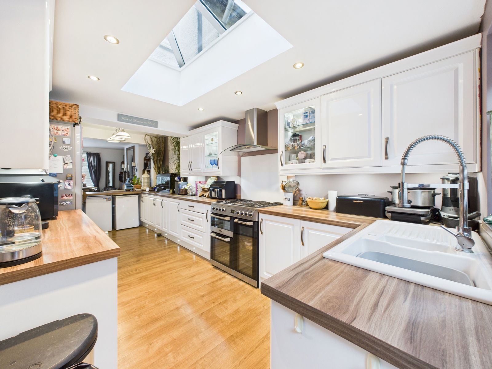 KITCHEN A stylish and spacious kitchen offering a wide range of white high gloss base and wall units, Cuisine Master range cooker with 5 ring gas hob and extractor above, 1 1/2 bowl porcelain sink and drainer, and plumbing and space for washing machine, tumble dryer and fridge freezer. Natural light floods in through a UPVC window, skylight and door leading out to the rear garden. Additional features include overhead spotlights and a gas central heating radiator.