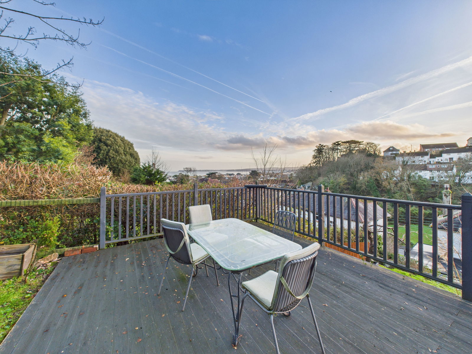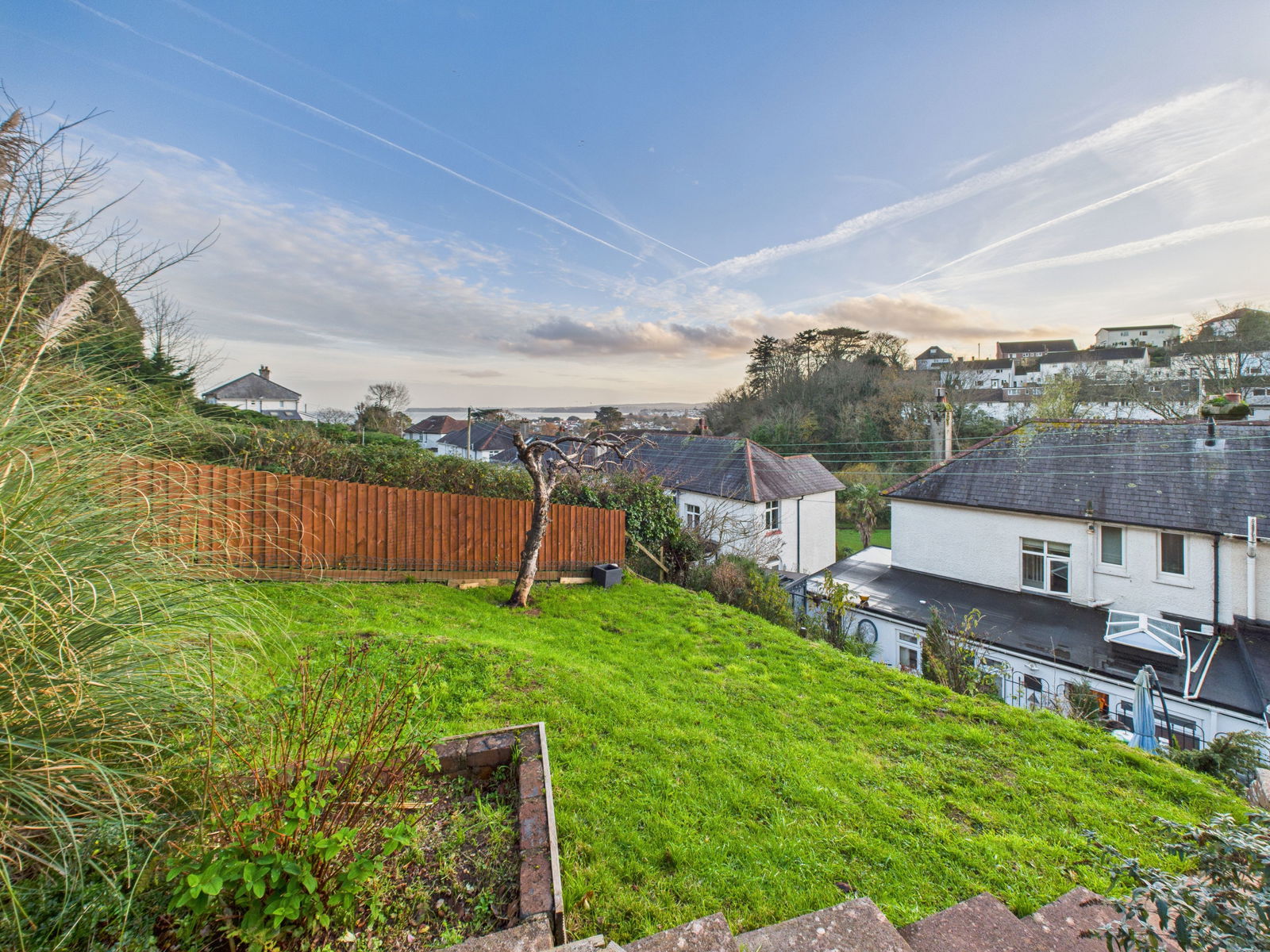 REAR GARDEN The rear garden has been thoughtfully arranged into low maintenance terraced levels. The first terrace offers a patio area with lighting and power supply, a rockery, and a shed with electricity. Additional features include outside tap, security lighting and access to the kitchen. Further tiers provide a lawned area with an apple tree and a large elevated sun deck boasting stunning sea views across the bay with pergola perfect for alfresco dining and outdoor entertaining.
