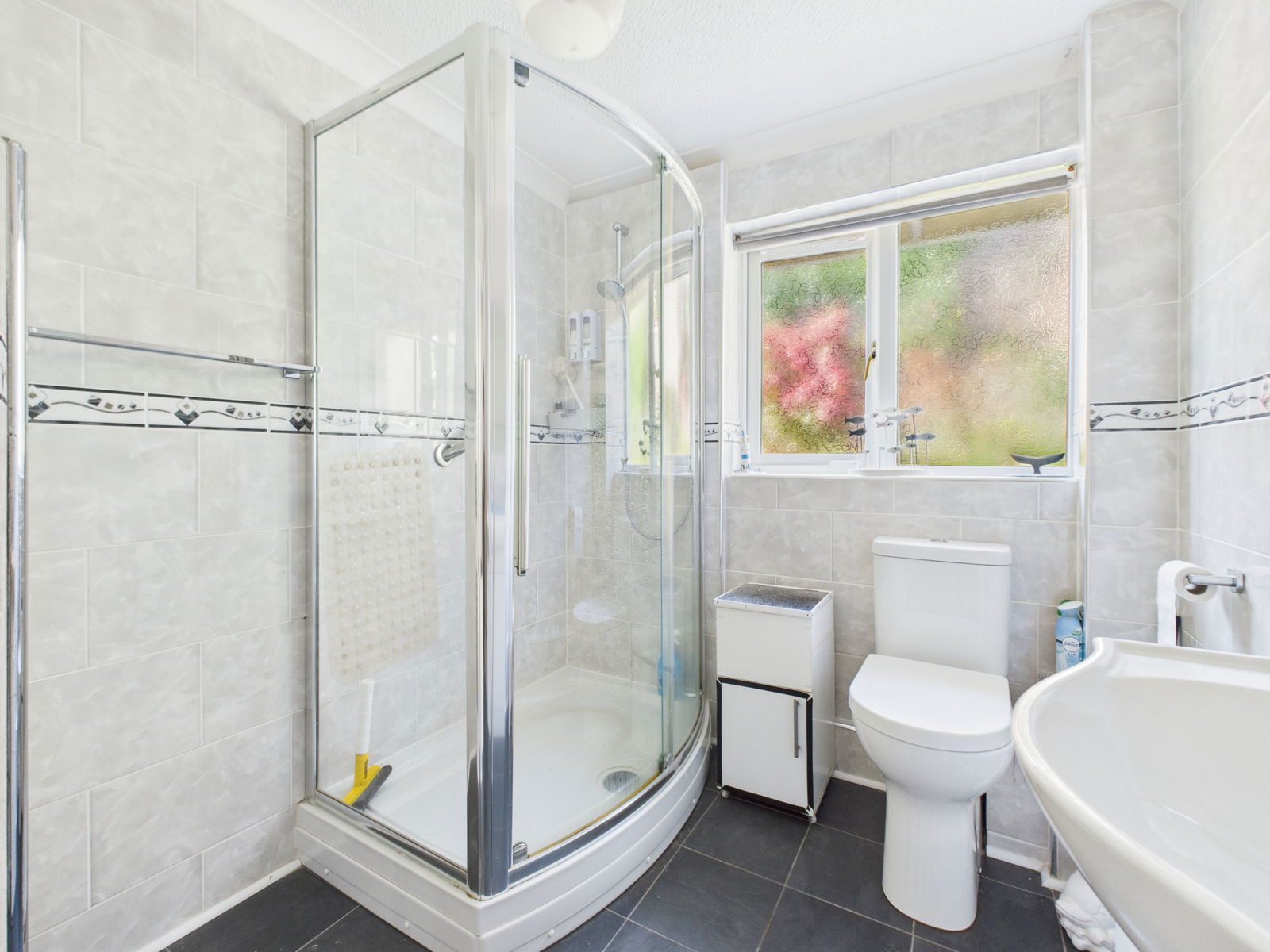 BATHROOM A 3 piece suite, including a walk in shower, toilet and wash basin. Alongside a heated towel rail accompanied by a tiled finish floor to ceiling.
