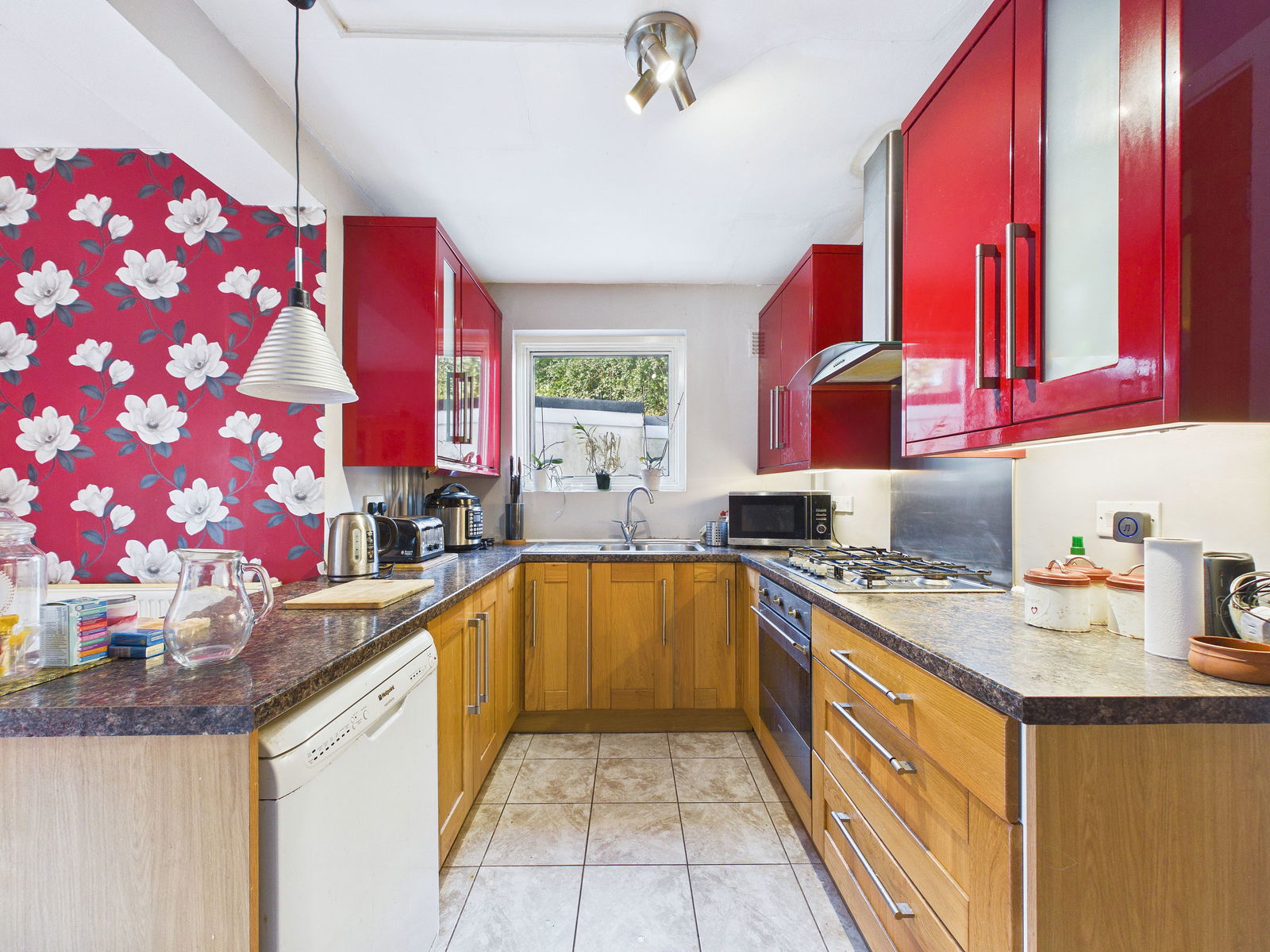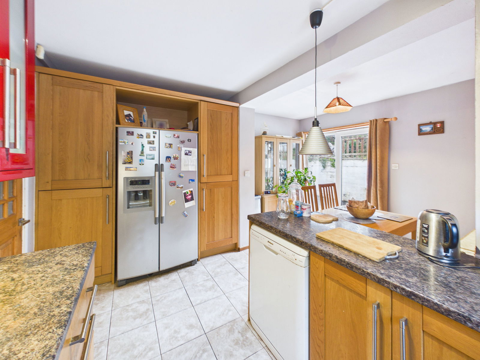 KITCHEN / DINER The spacious kitchen/diner is fitted with a range of wall, base and drawer units with roll edged work surfaces. Appliances include a 1 1/2 bowl stainless steel sink with drainer, electric single oven with grill, five ring gas hob with extractor hood, and space with plumbing for a dishwasher and an American style fridge freezer. Two deep fitted larder cupboards provide excellent storage, ample space allows for a 6 seater dining table. uPVC double glazed tilt and turn doors open directly onto the rear garden and a gas central heating radiator.
