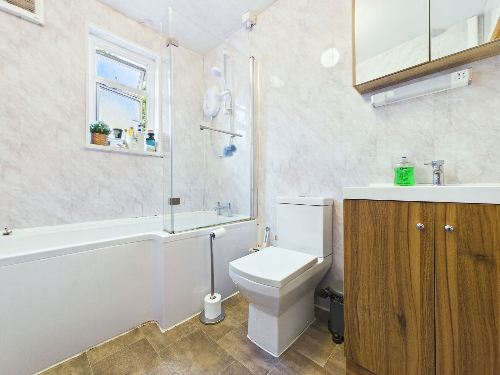 BATHROOM A three piece suite comprising a low level WC, vanity wash hand basin with fitted storage and a panelled P shaped bath with shower attachments over. Finished with PVC panelled walls, a uPVC obscure double glazed window and a chrome heated towel rail.