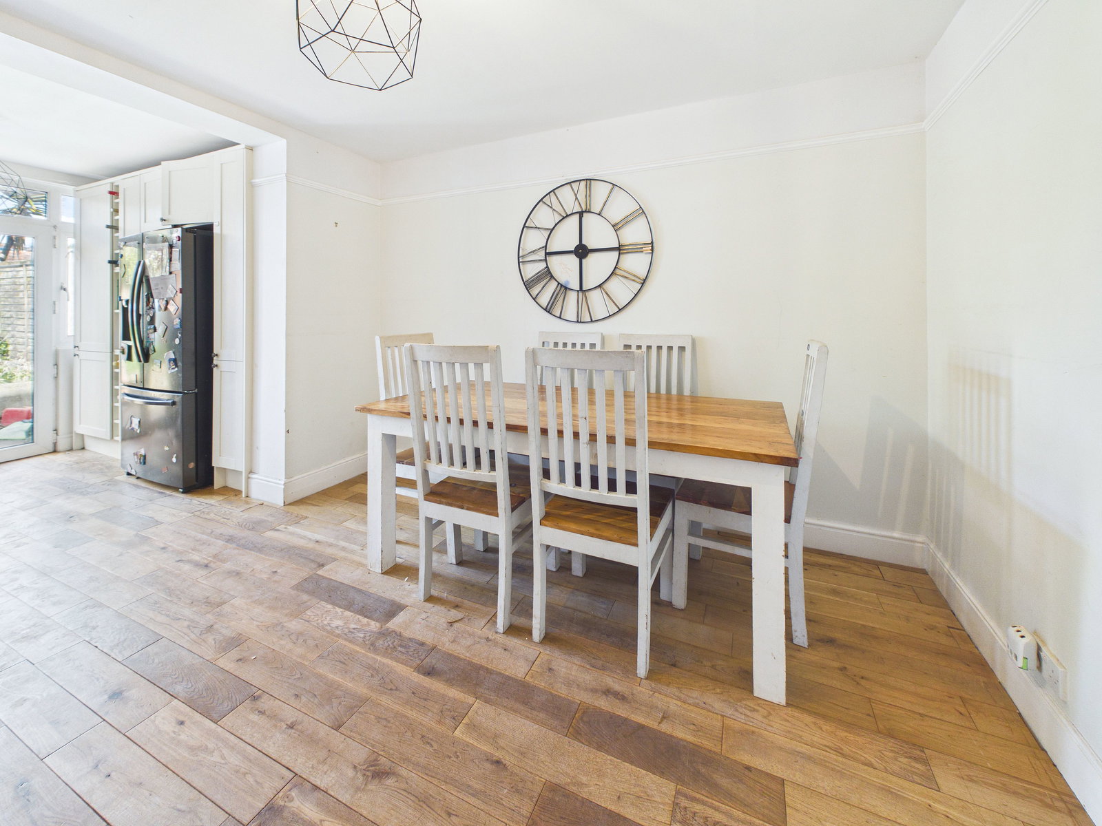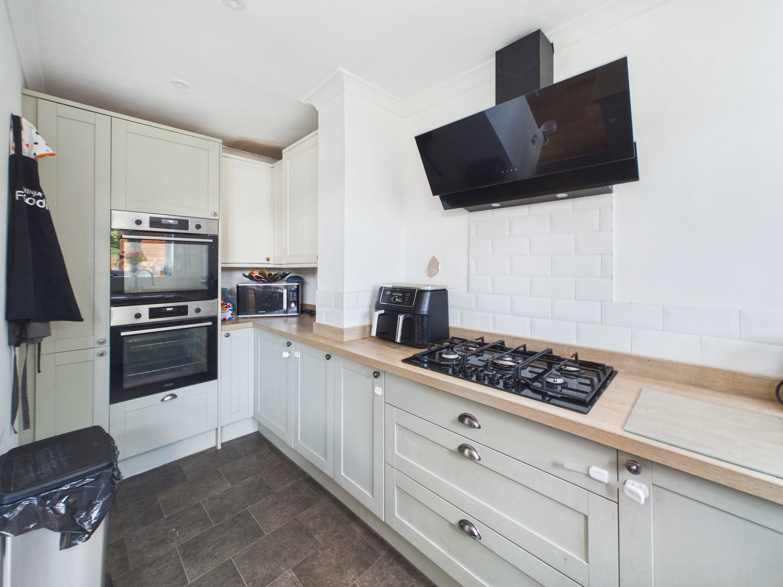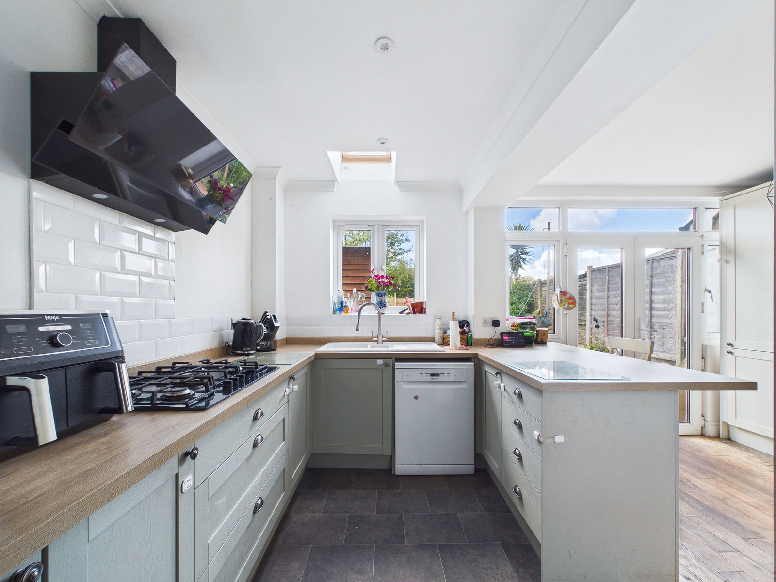 KITCHEN / DINER An impressive open plan kitchen/dining space, ideal for modern family living and entertaining. The kitchen is fitted with a comprehensive range of wall, base, and drawer units topped with square edged work surfaces. Additional features include a 1.5 bowl ceramic sink with drainer, an integrated eye level electric double oven with grill, and a five ring gas hob with extractor hood above. There is an integrated stacked washing machine and dryer, along with space and plumbing for a dishwasher and an American style fridge freezer. A cupboard houses the recently installed Worcester combination boiler. A uPVC double glazed window and French doors open directly onto the garden, while ample space accommodates a 6/8 seater dining table. Finished with a gas central heating radiator.
