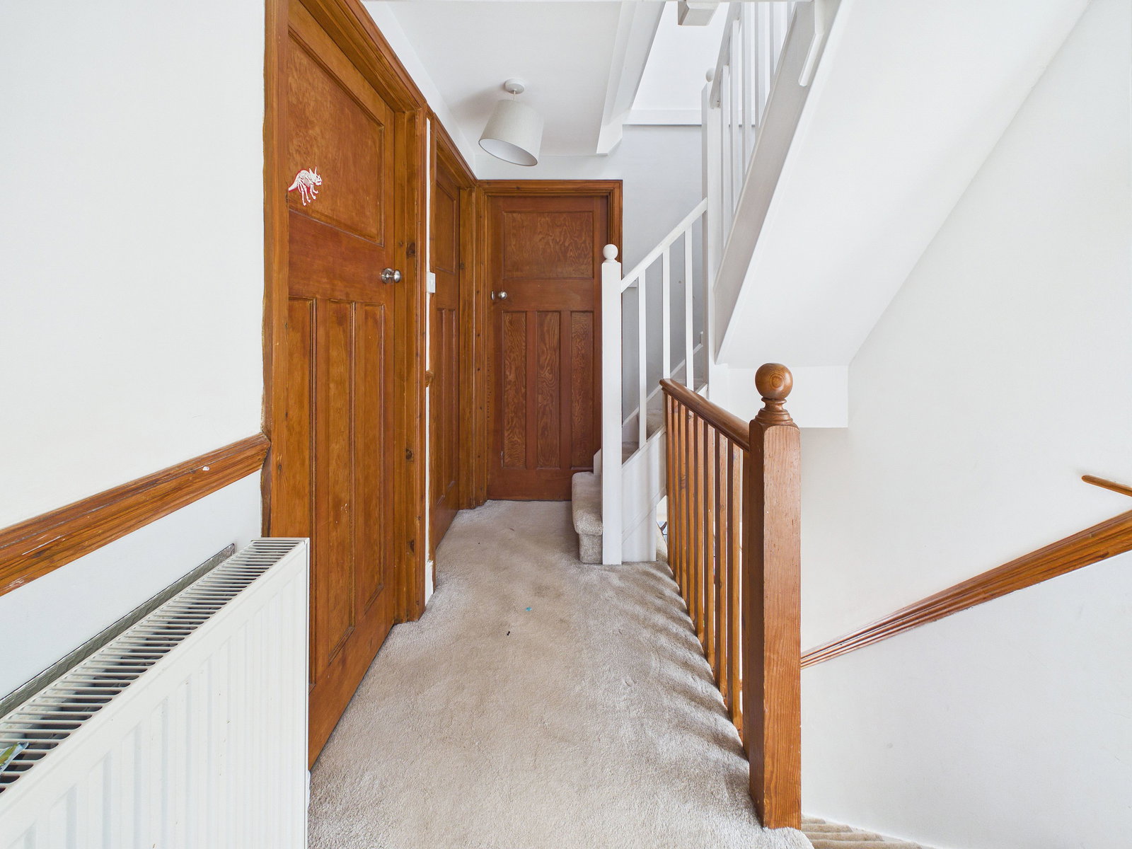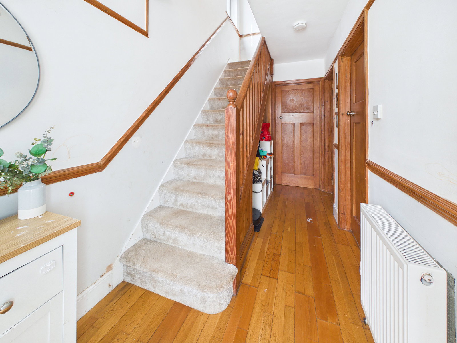 HALLWAY A spacious and welcoming hallway with stairs rising to the first floor. Doors provide access to all principal ground floor rooms, complemented by overhead lighting and a gas central heating radiator.