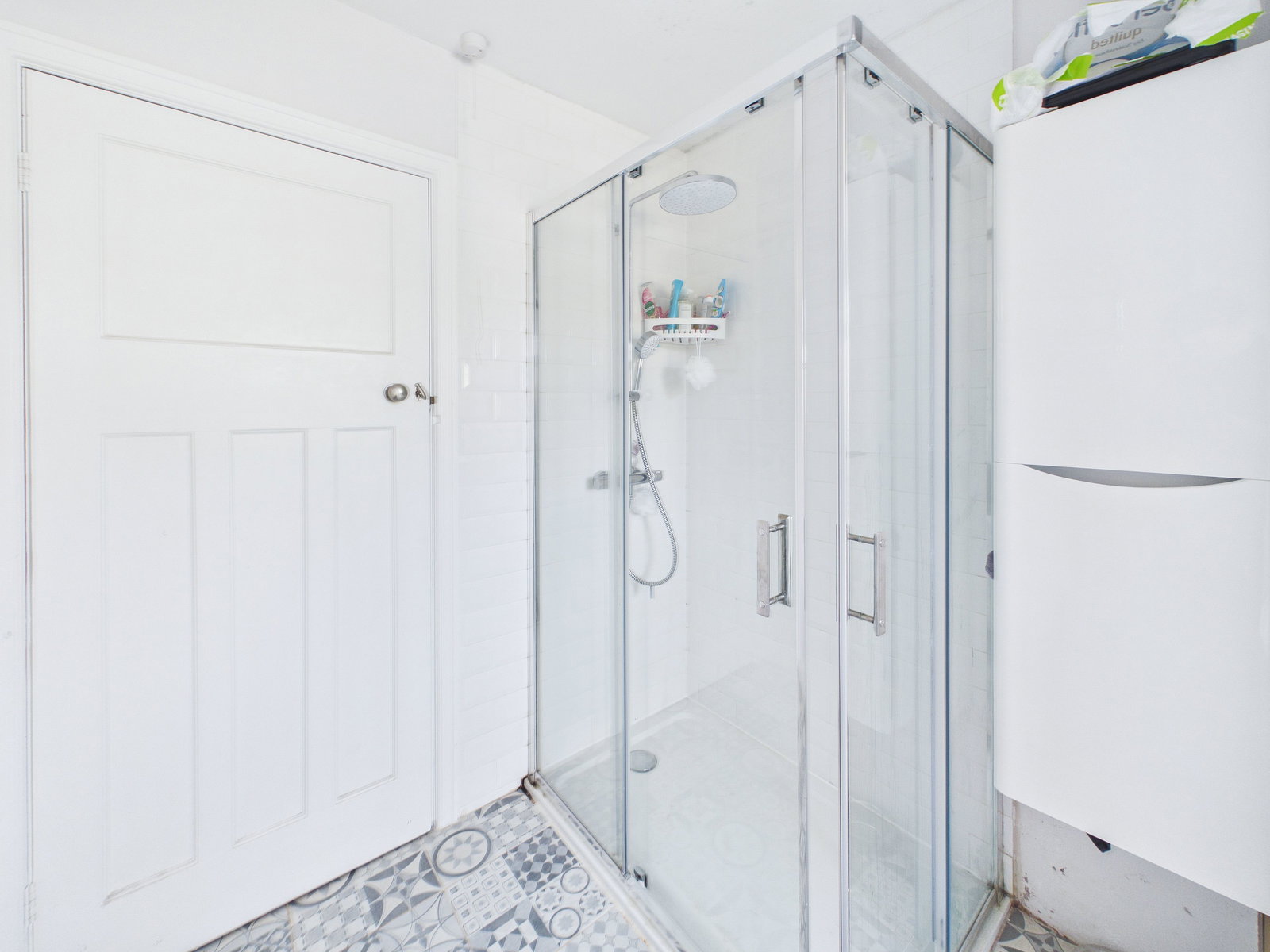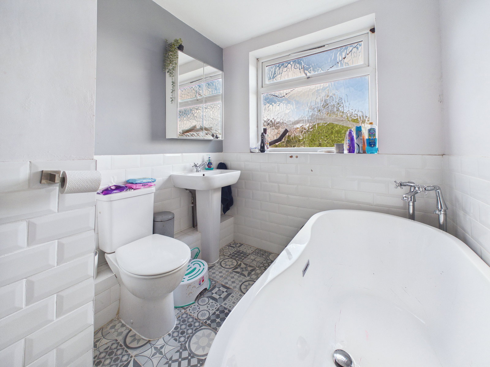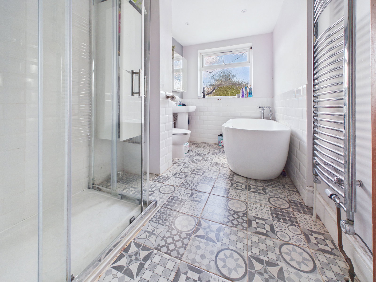 BATHROOM A spacious and contemporary family bathroom featuring a low level WC, pedestal wash hand basin, walk in double shower, and a freestanding bathtub. Finished with modern tiling, a wall mounted mirrored cabinet, uPVC double glazed obscure window, and a chrome heated towel rail.