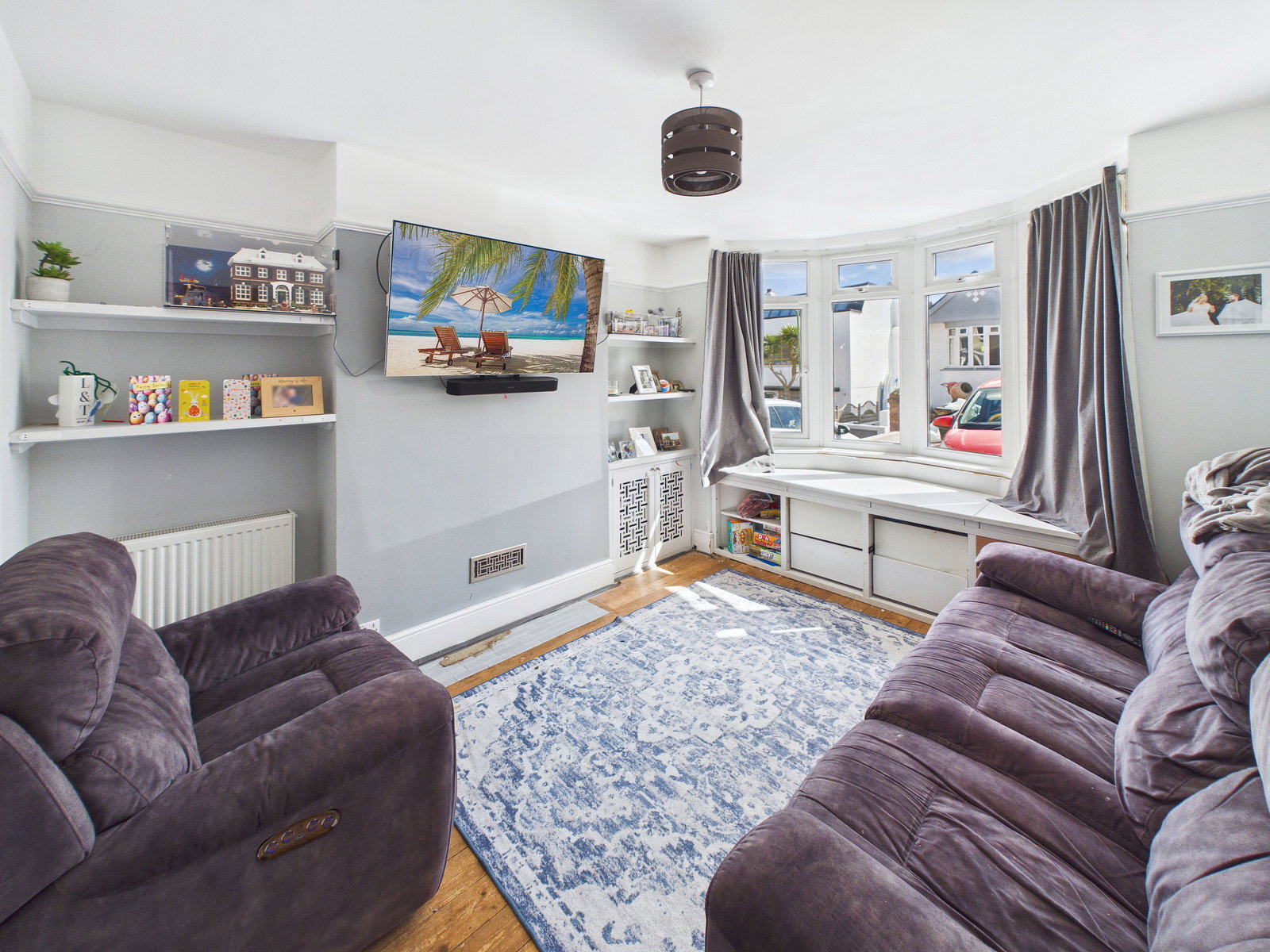 LIVING ROOM A bright and generously proportioned living room positioned at the front of the property. Features include a TV point, a bespoke built in bay window bench with storage, a large uPVC double glazed bay window, and a gas central heating radiator.