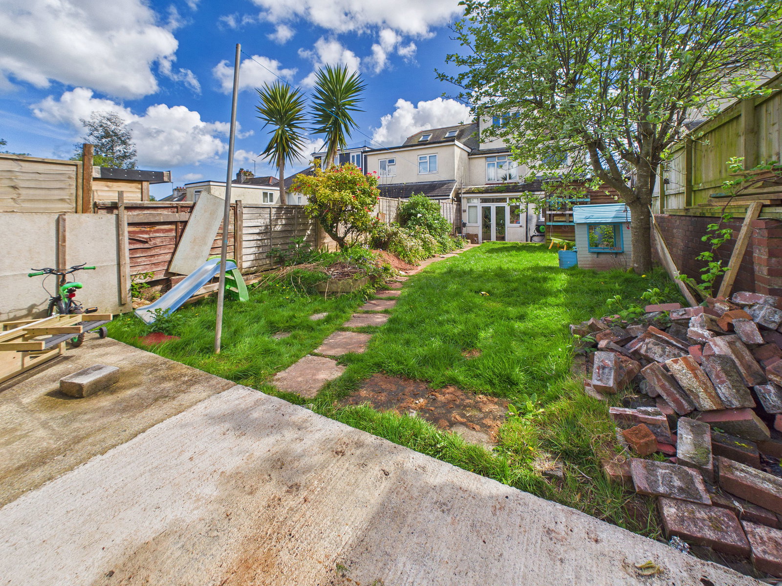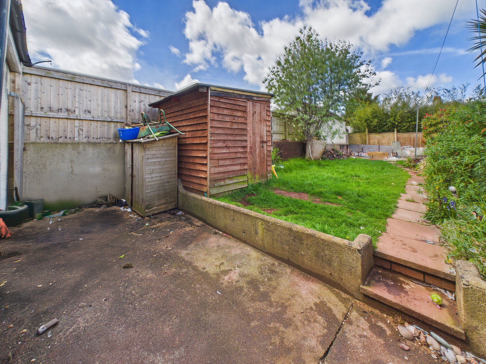 OUTSIDE To the rear, a beautifully sized and sunny garden begins with a patio area directly accessed from the kitchen/diner. Steps lead up to a large lawn bordered by mature shrubs, plants, and trees, extending to a further generous concreted patio area at the rear perfect for alfresco dining and outdoor entertaining.