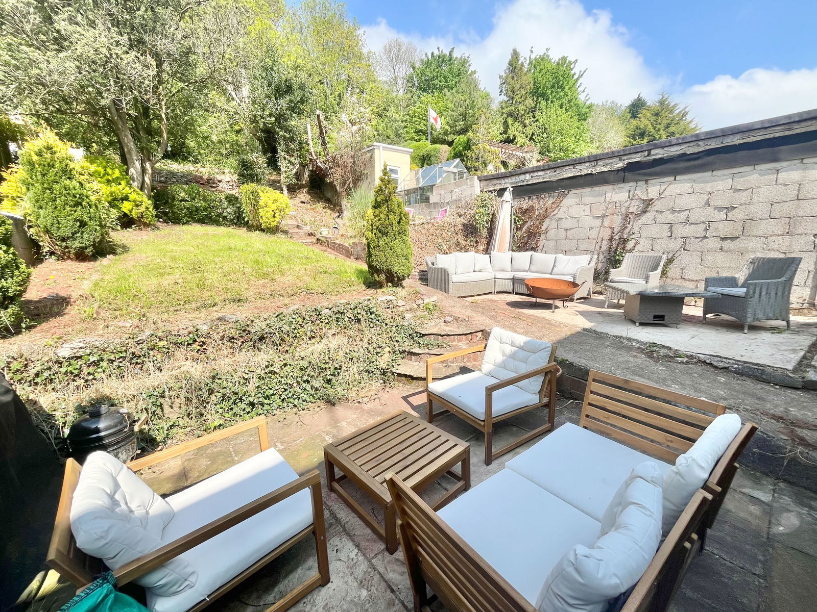 REAR A long garden with patio adjacent to the house and 3 steps to a lawned area with shrub borders. Steps lead to a terraced part of the garden which is laid to lawn onto a wooded copse at the rear.
