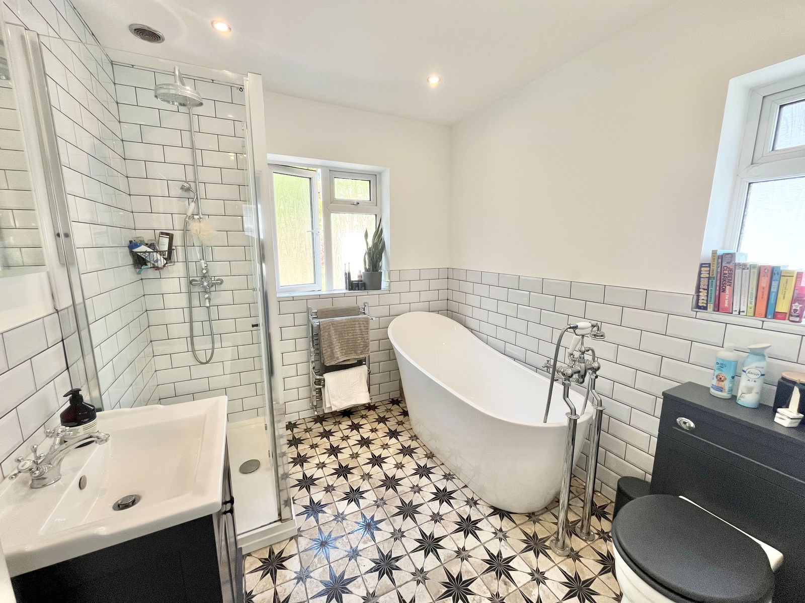 BATHROOM Luxury 4 piece suite comprising slipper bath, shower cubicle. Vanity basin. Closed coupled WC. Part metro tiled walls.