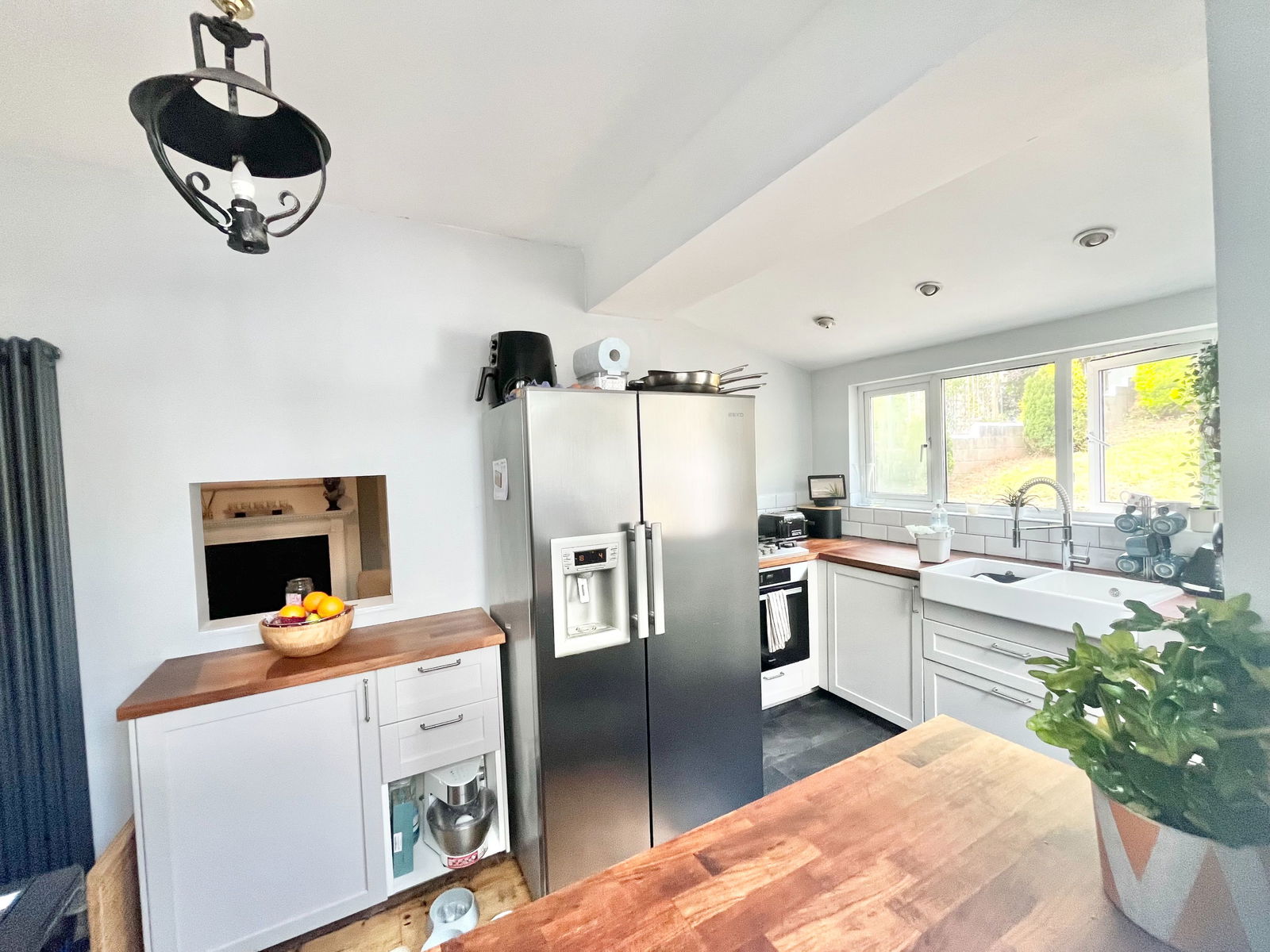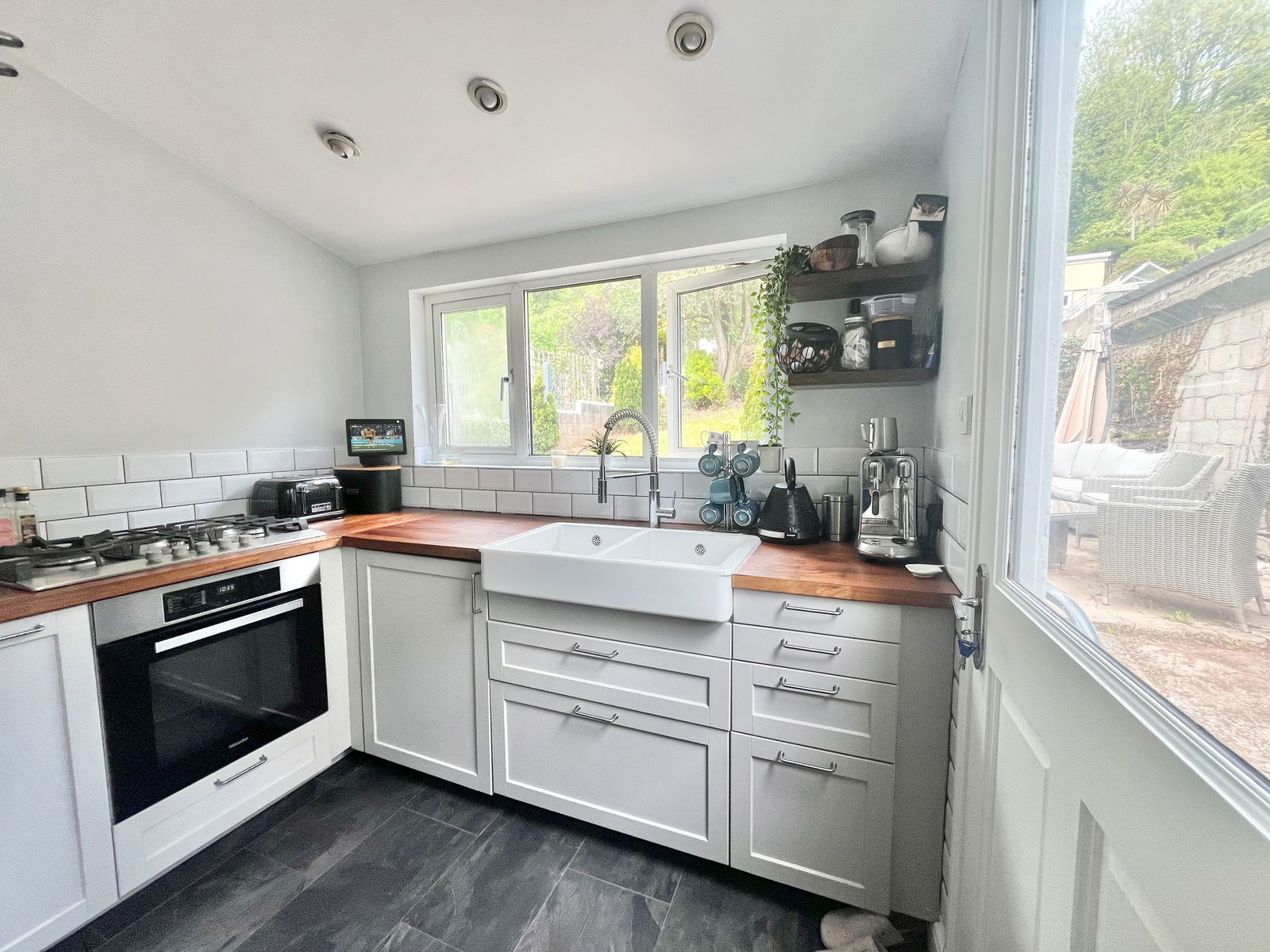 KITCHEN - 4.5m x 2.5m (14'9" x 8'2") (L-shaped at widest) Ceramic sink with wooden work surfaces to either side with cupboards and drawers under. Gas hob with oven below. Range of worktops. Stripped wood floor. Gas boiler for central heating and hot water. Dual aspect double glazed window. Back door to garden.