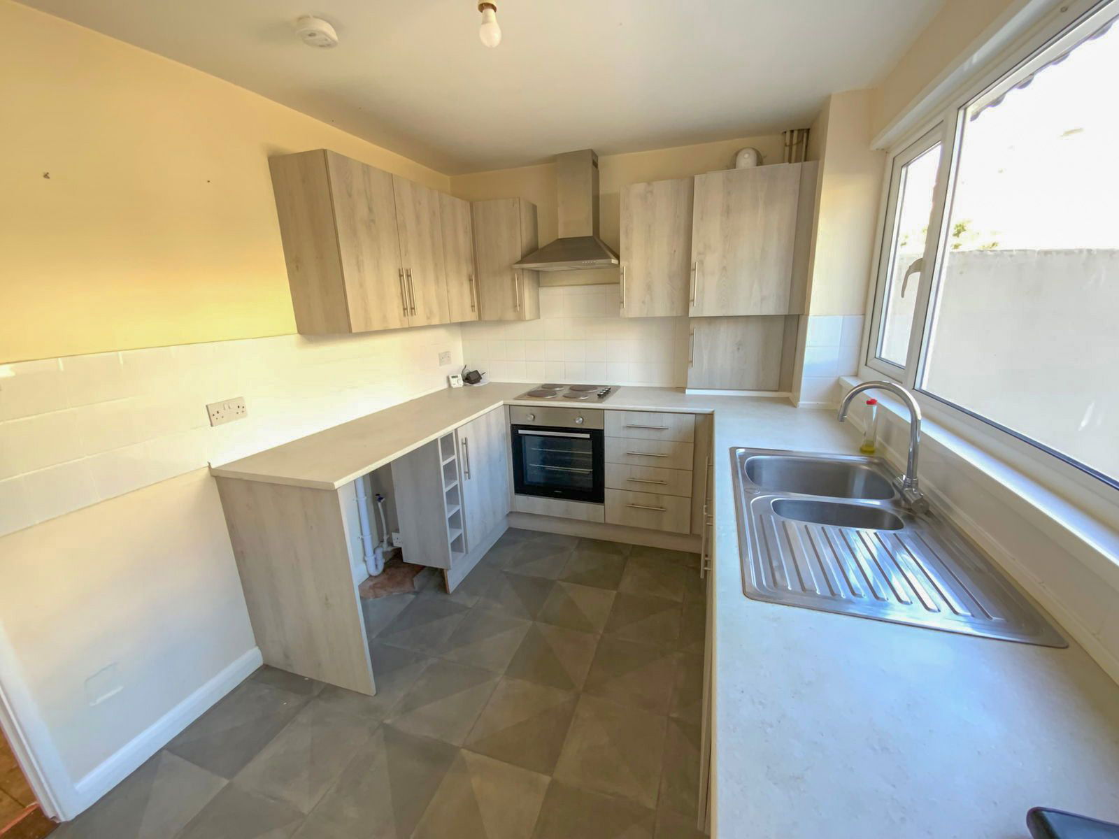 KITCHEN - 3.6m x 2.4m (11'9" x 7'10") Fitted with a range of grey woodgrain effect wall and base units with slim roll edge worksurfaces. 1.5 bowl sink with drainer stainless steel sink unit with mixer tap over. Appliance space for tumble dryer. Built-in Lamona oven and grill plus matching stainless steel electric hob and stainless steel cooker hood over. Cupboard housing Ideal Atlantic gas boiler for central heating and hot water. Appliance space with plumbing for washing machine, space for upright fridge/freezer. Double glazed window to the front. Part tiled walls. Central heating radiator and door to:-
