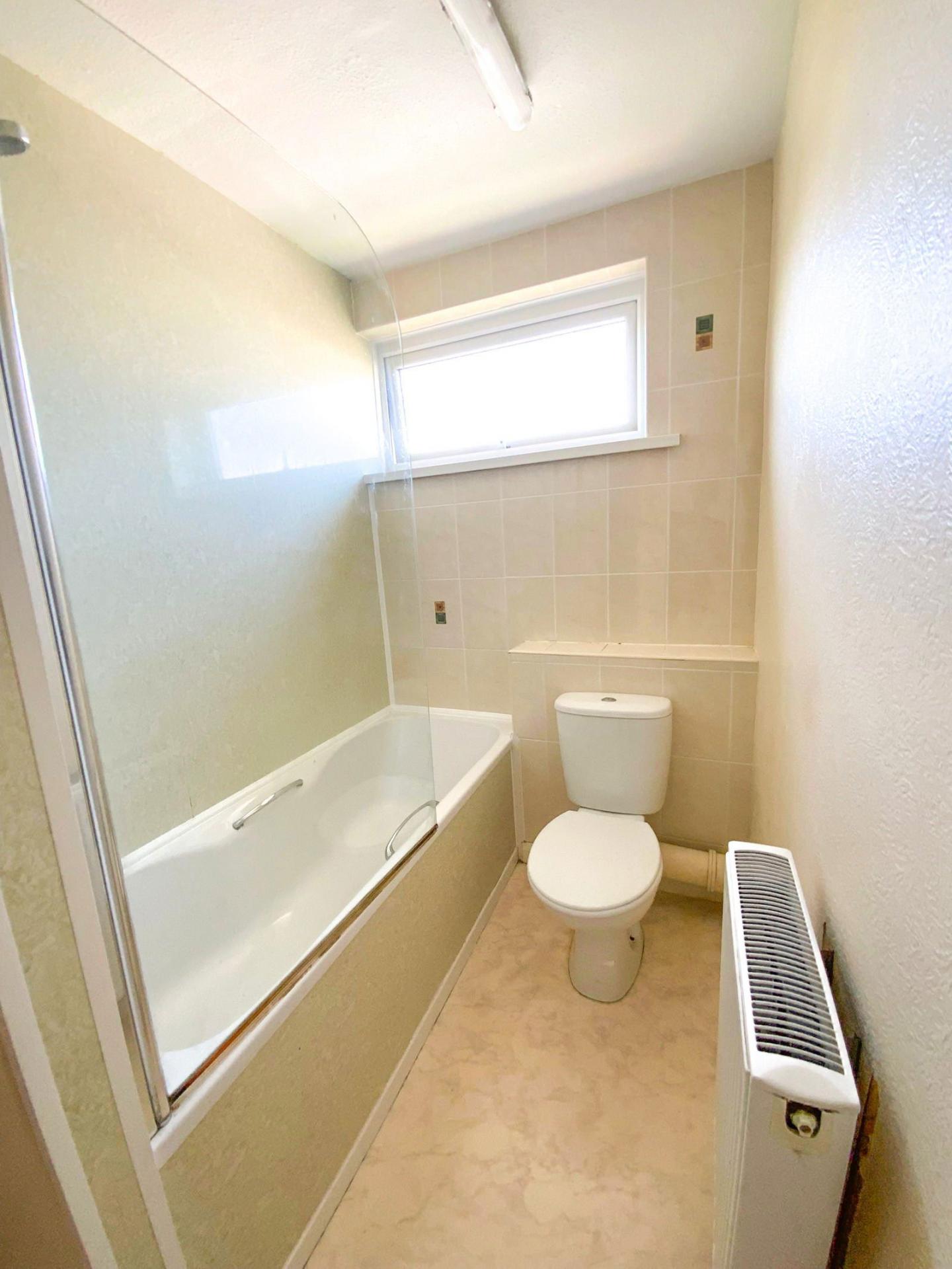 BATHROOM Fitted with a white suite comprising panelled bath with shower attachment and acrylic panelling to the walls. Washing basin and close coupled WC with dual flush. Part tiled walls. Radiator. Double glazed window.