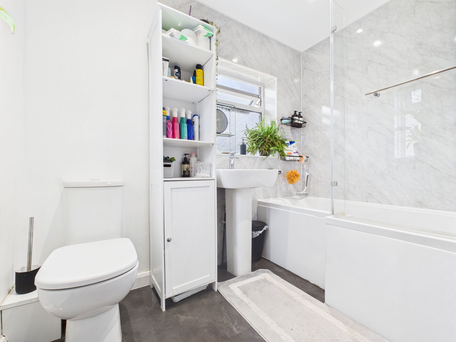 BATHROOM A contemporary family bathroom featuring a low level WC, pedestal wash hand basin, and a P shaped panelled bath with overhead shower and glass screen. Finished with modern wall panelling, an extractor fan, uPVC obscure double glazed window and chrome heated towel rail.