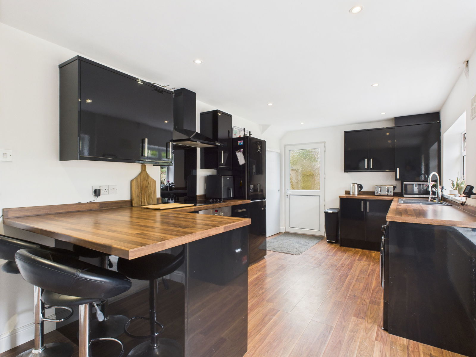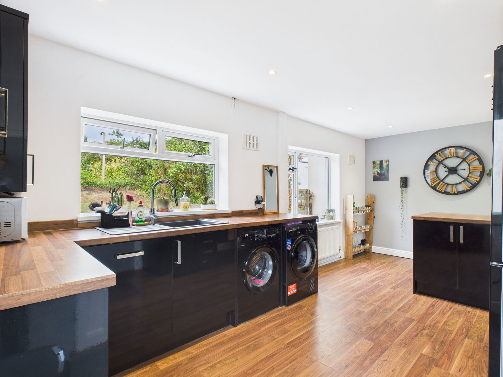 KITCHEN / BREAKFAST ROOM This impressive kitchen/breakfast room boasts an extensive range of wall, base and drawer units topped with roll edged work surfaces. It includes a 1 bowl composite sink with drainer, an integrated electric oven and grill, four ring induction hob with extractor above and an integral dishwasher. There is also space and plumbing for a washing machine, tumble dryer and fridge freezer. A breakfast bar offers casual seating, complemented by a deep fitted pantry cupboard. uPVC double glazed windows and a door open directly onto the rear gardens.