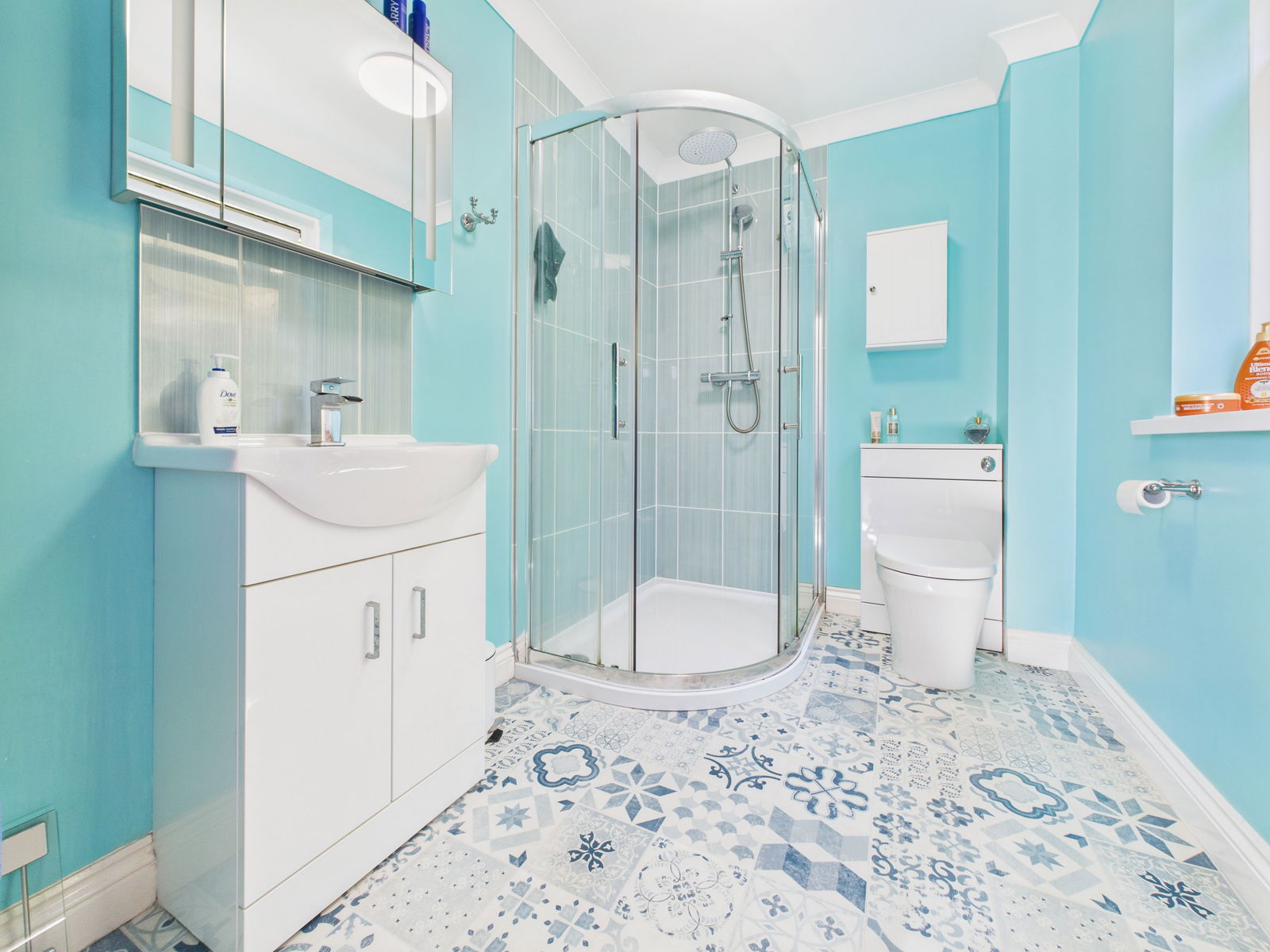 EN-SUITE A modern en-suite comprising a low level WC, vanity wash hand basin with fitted storage below, and a walk in double shower. Finished with part tiling, a uPVC obscure double glazed window and a chrome heated towel rail.