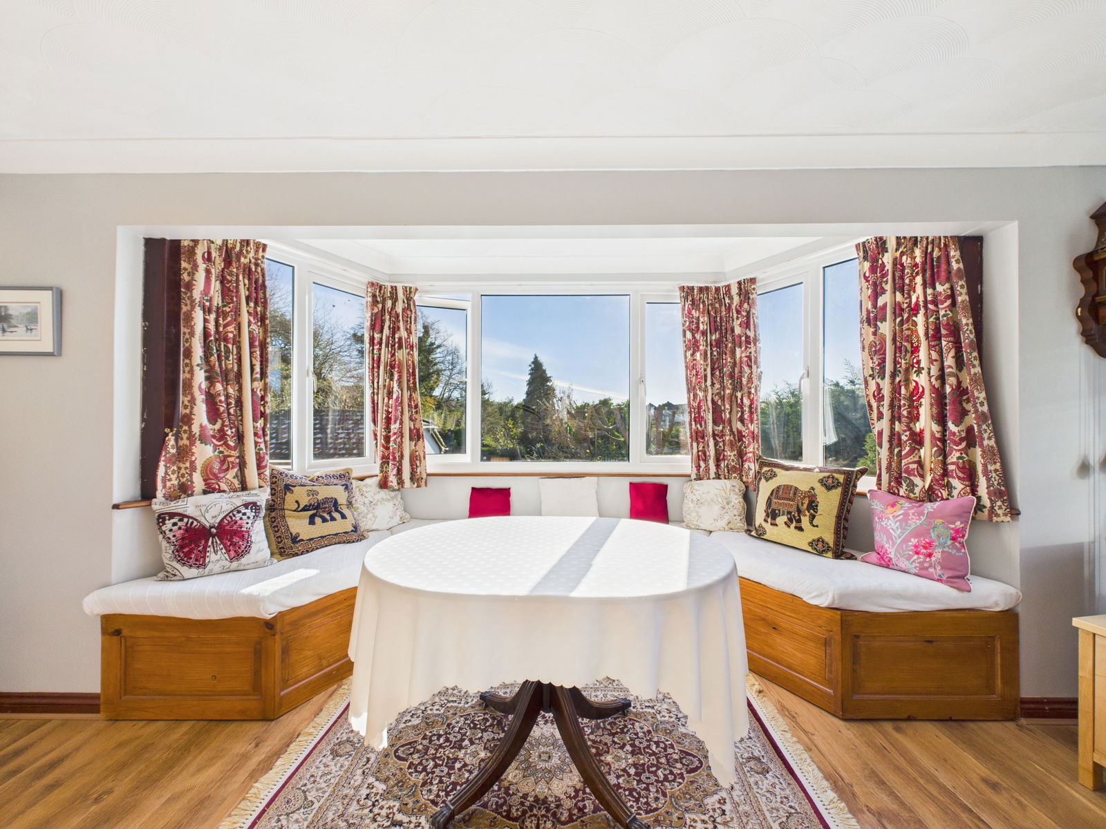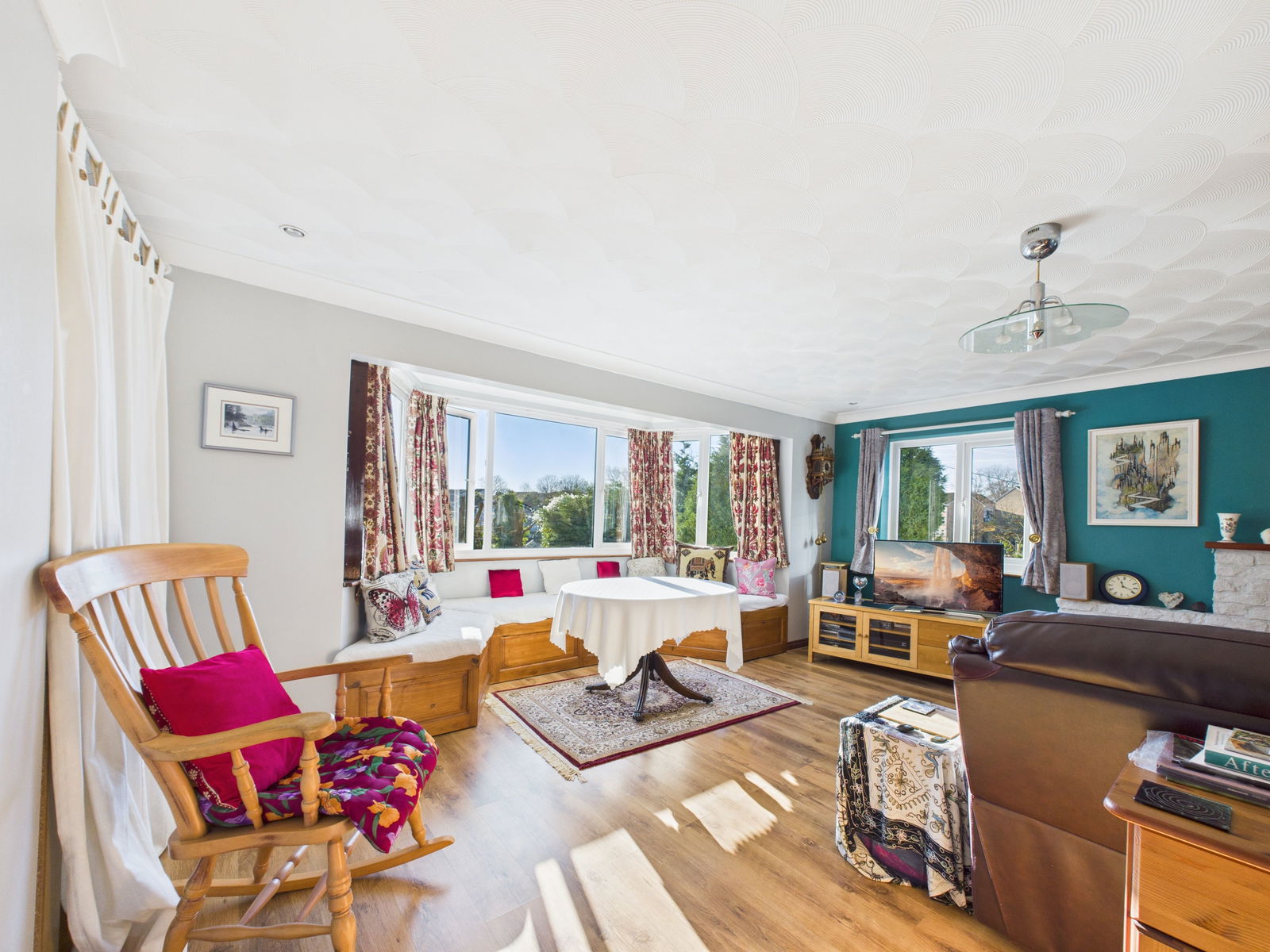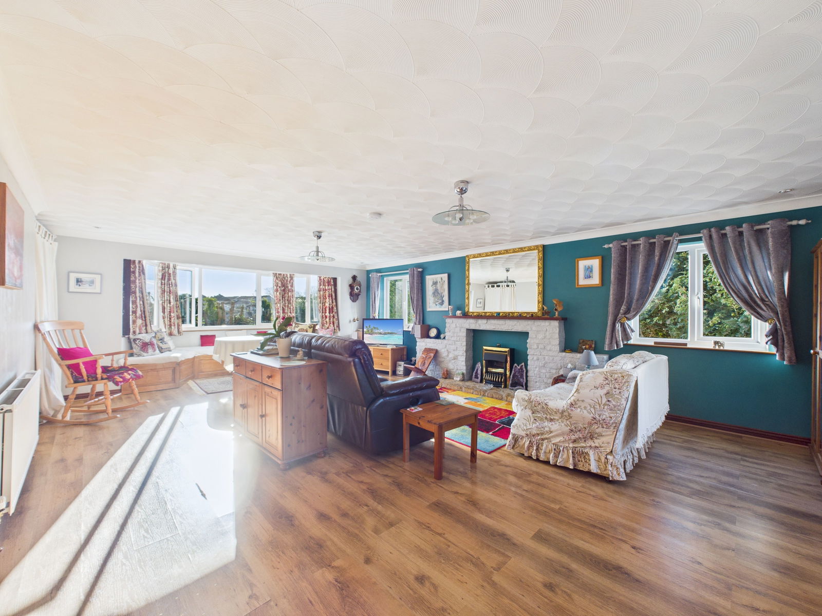 LIVING ROOM An impressively large, sun soaked living room offering superb space and an ideal setting for entertaining. Features include a gas fireplace, TV point, triple aspect uPVC double glazing with windows to the rear and side, and a bay window overlooking the beautifully manicured front gardens. Additional highlights include built in bay seating, overhead lighting, a deep storage nook and two gas central heated radiators.