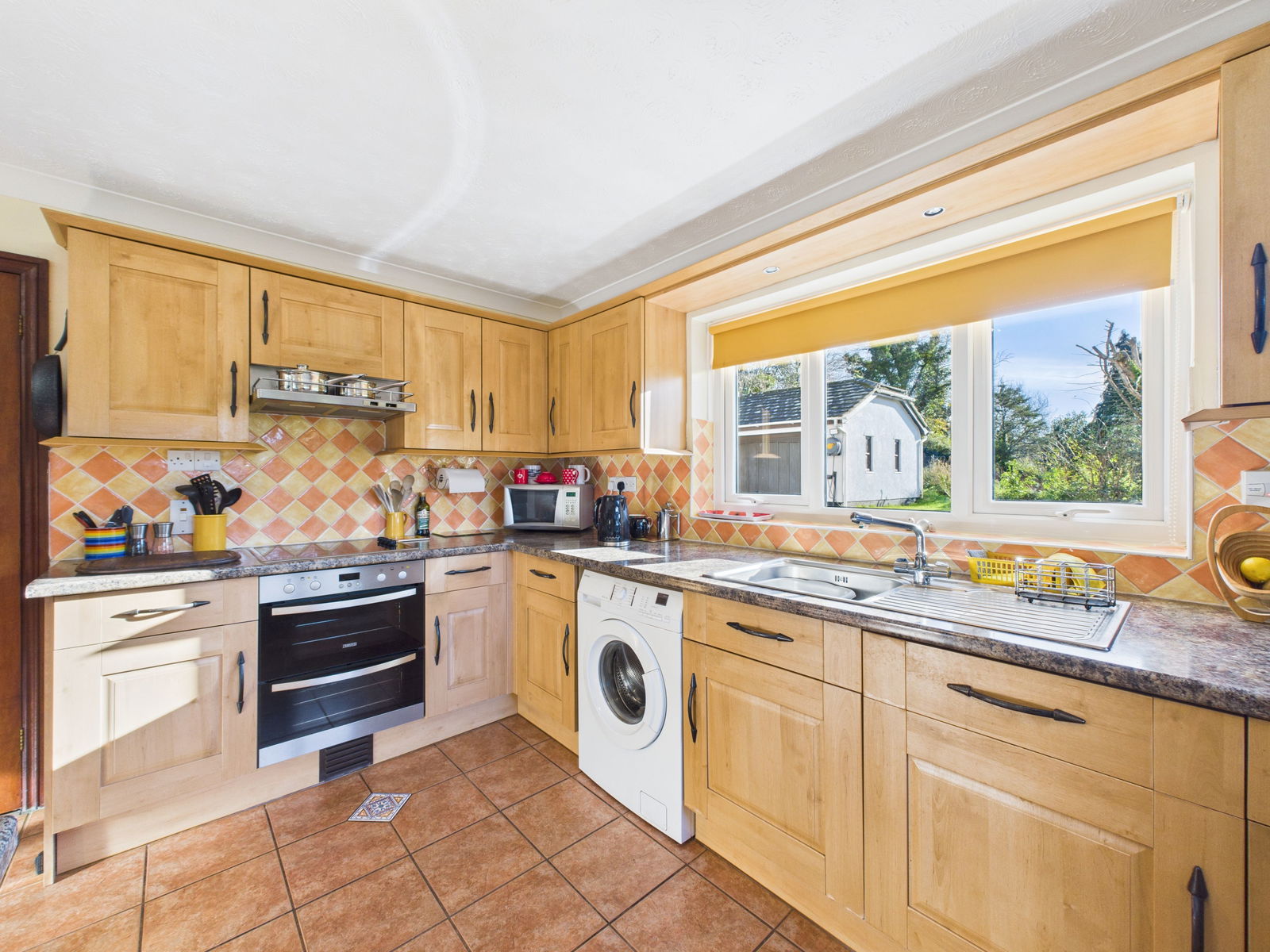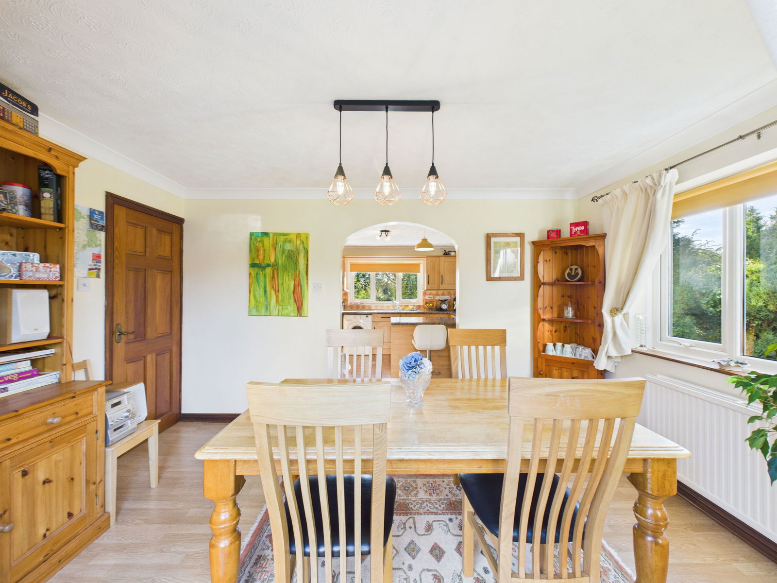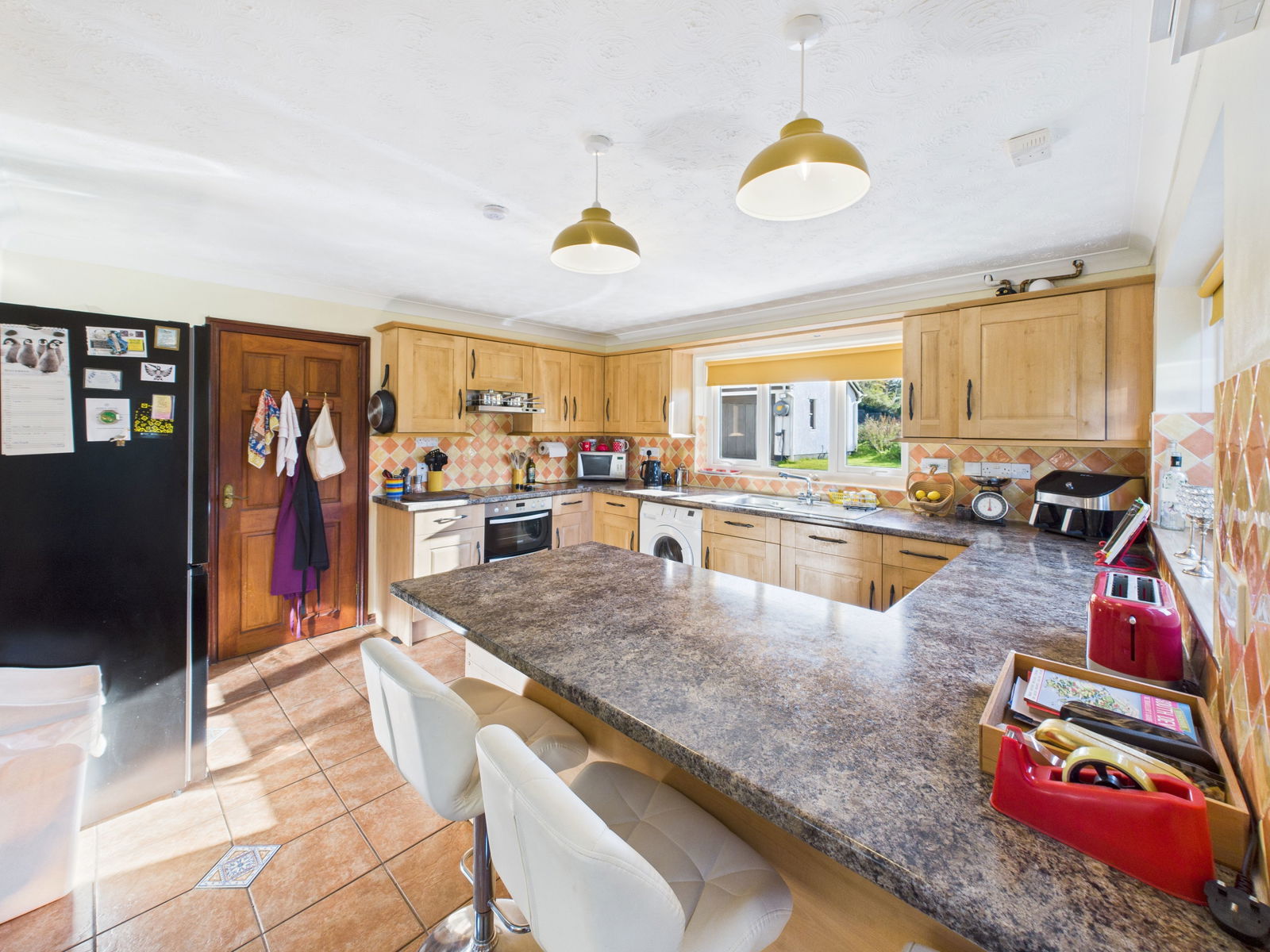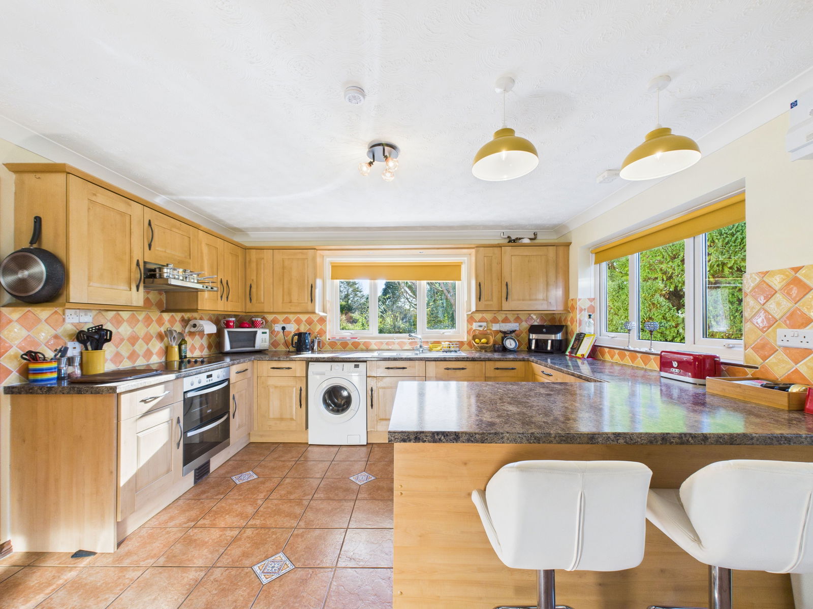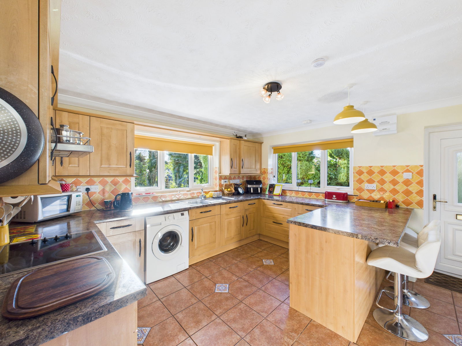 KITCHEN / DINER A wonderfully spacious, light filled kitchen/diner ideal for modern living and entertaining. The kitchen offers an extensive range of overhead, base and drawer units complemented by roll edged work surfaces. Integrated appliances include an electric double oven with grill, a four ring induction hob, a dishwasher and an under counter fridge. There is also space and plumbing for a washing machine and tall fridge freezer. Additional features include a 1 bowl stainless steel sink and drainer, tiled back splash and a scenic outlook across both the front and rear gardens. Triple aspect uPVC double glazed windows to the front and side, plus French doors opening to the rear garden flood the room with natural light. Ample space is provided for a 6/8 seater dining table, alongside breakfast bar seating and a gas central heated radiator.