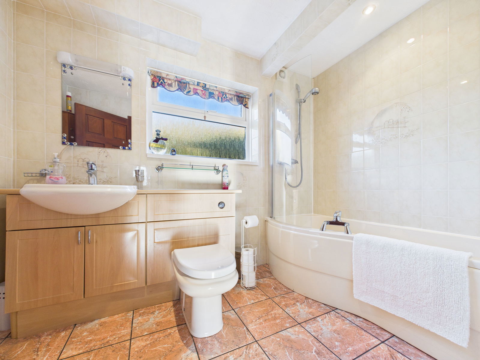 BATHROOM A spacious family bathroom comprising a low level WC, vanity wash hand basin with fitted storage below and a panelled bath with shower over and protective glass screen. Finished with complementary tiling, a uPVC obscure double glazed window, extractor fan and a gas central heated radiator.