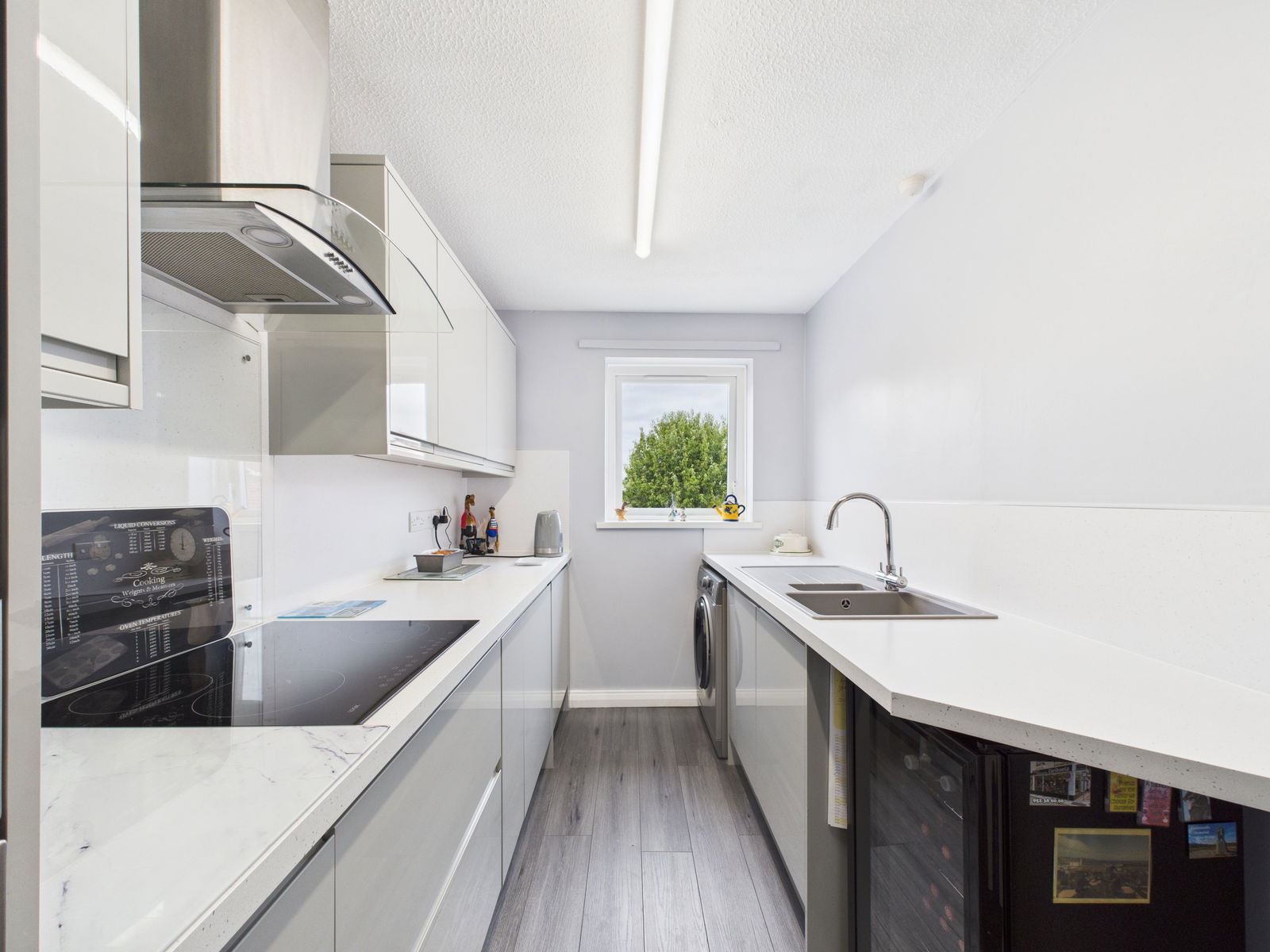 KITCHEN A beautifully presented, recently fitted kitchen designed with both style and practicality in mind. It offers a comprehensive range of wall, base and drawer units with sleek square edged work surfaces. The space is fully equipped with a 1 1/2 bowl composite sink and drainer, integrated eye level electric oven with grill, built in microwave, four ring induction hob with extractor above and integrated fridge and freezer. There is also space and plumbing for a washing machine and a uPVC double glazed window.