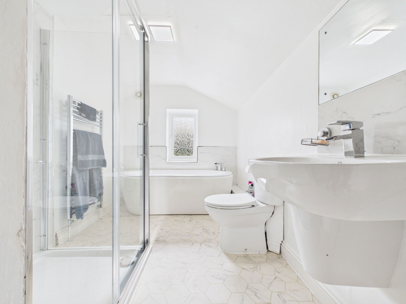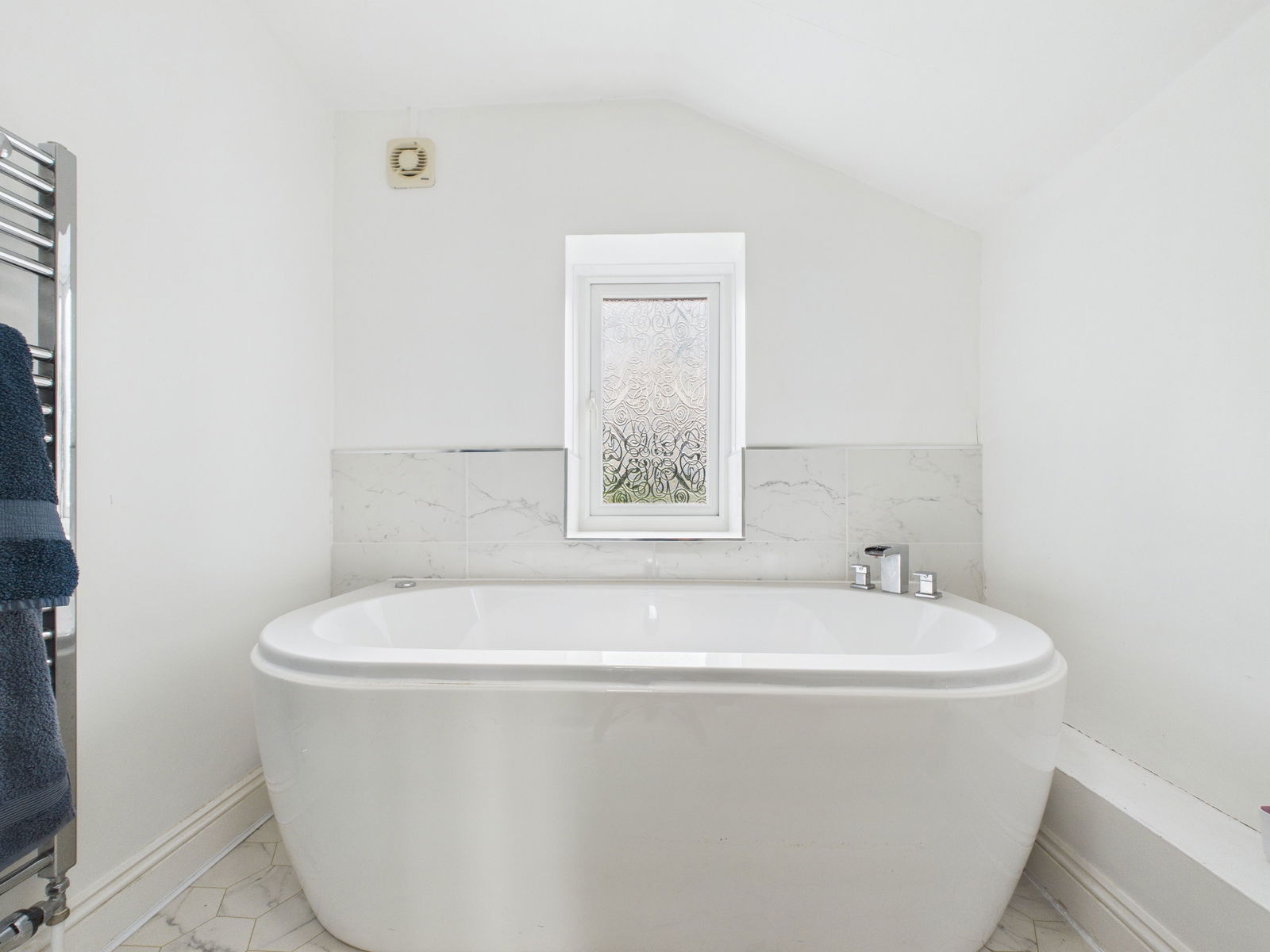 BATHROOM Replaced luxury four piece suite comprising Jacuzzi tub style bath with water flow taps, pedestal wash basin with water flow taps, double shower cubicle with mains shower, low level WC, part tiled, uPVC double glazing and linen cupboard.