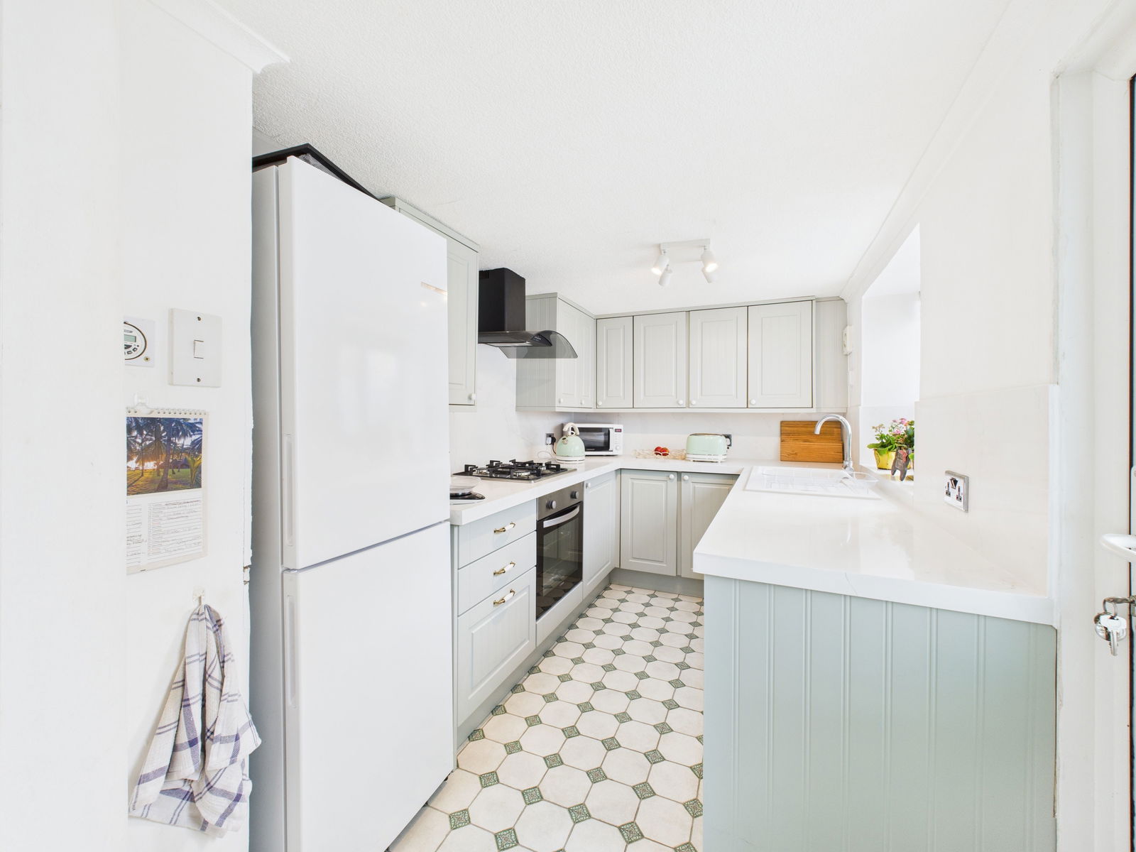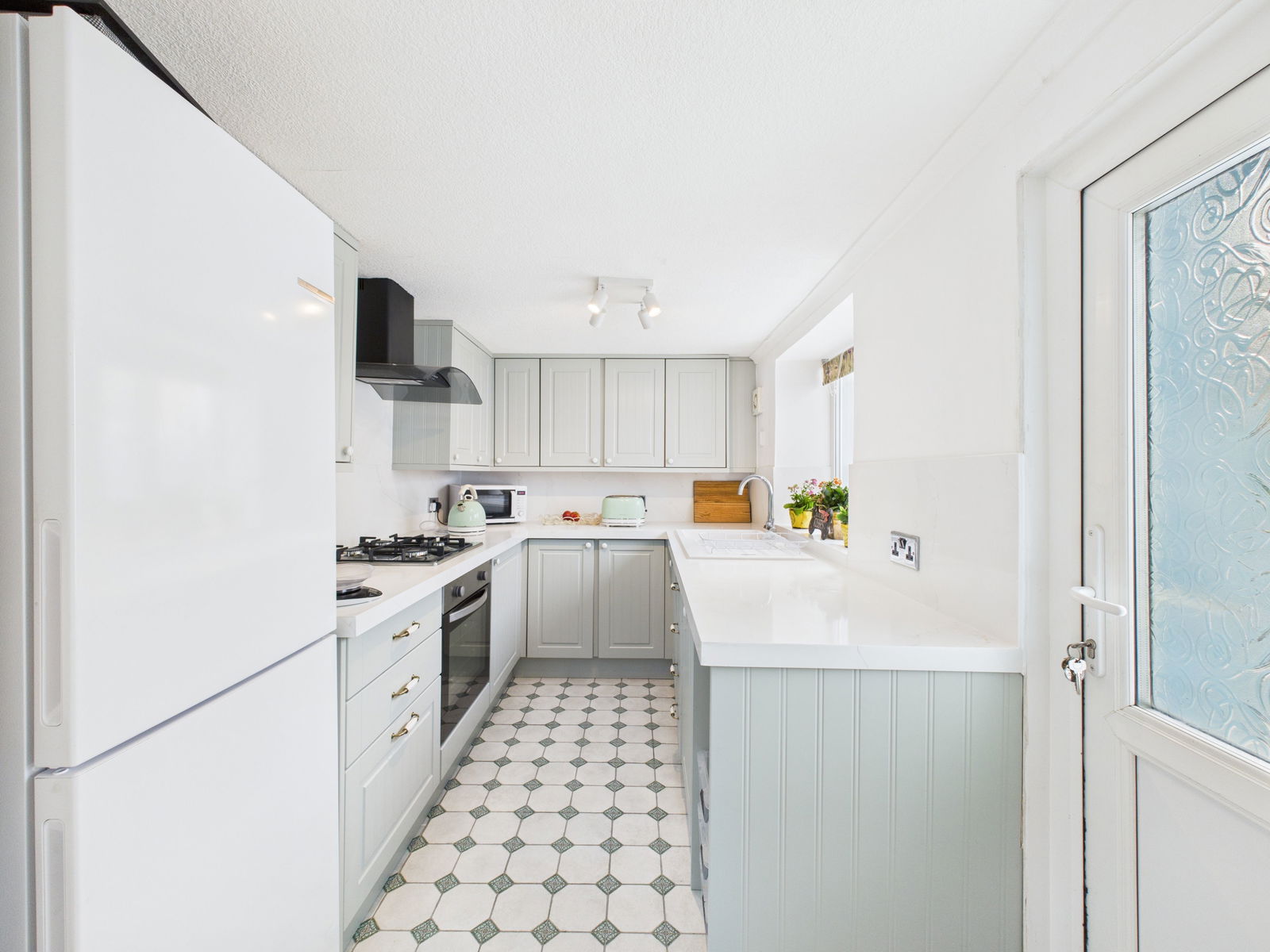 KITCHEN - 3.35m x 1.93m (10'11" x 6'3") Stunning bespoke kitchen under warranty with fitted luxury kitchen comprising 1.5 bowl sink unit with adjoining quartz fronted units comprising range of wall and base units. Inset gas hob with electric oven and grill under. Matching wall units, appliance space and with power, uPVC double glazed window and door.