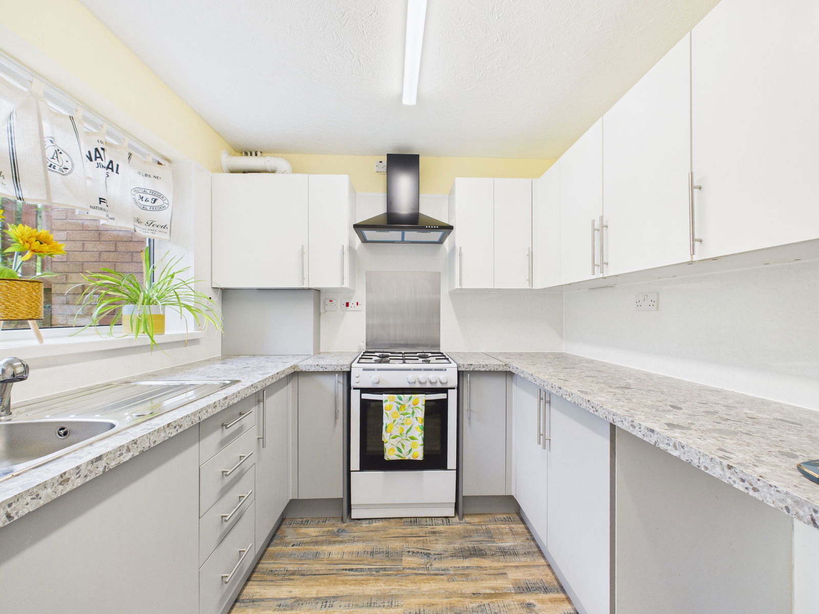 KITCHEN A beautifully presented contemporary kitchen offering a range of wall, base and drawer units topped with roll edged work surfaces. Complete with a gas cooker and extractor hood, stainless steel sink and drainer and dedicated space and plumbing for a washing machine, dryer and fridge freezer. Finished with panelled splashbacks and a uPVC double glazed window.
