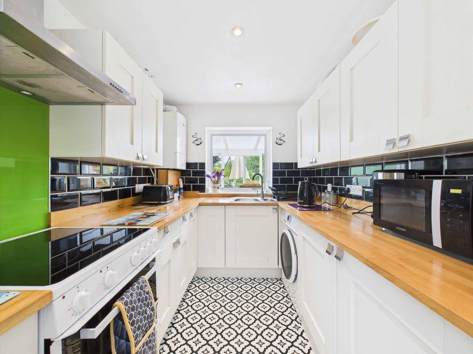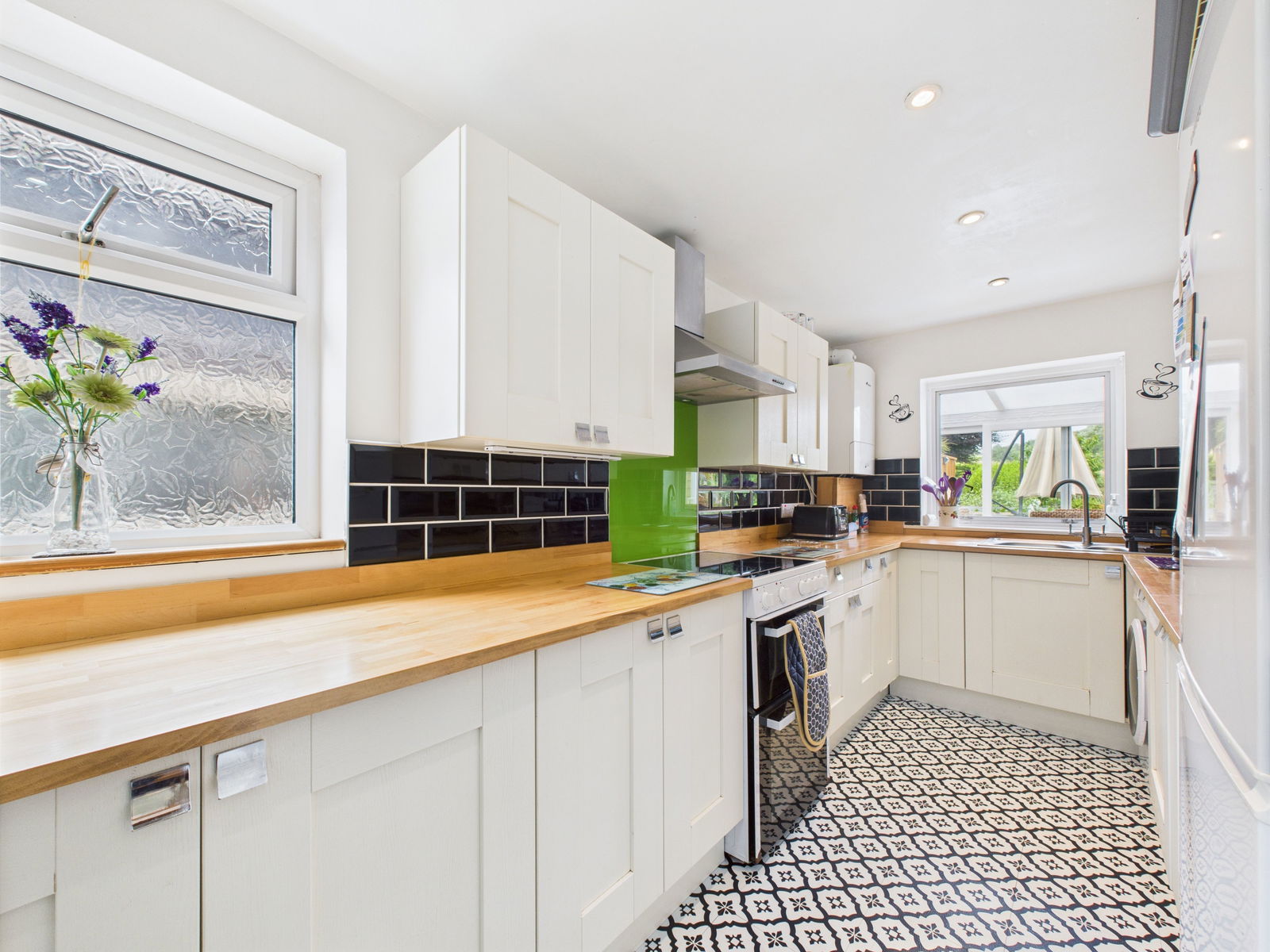 KITCHEN A modern farm style kitchen boasting a range of overhead, base and drawer shaker style units with wood work surfaces above. A 1 1/2 bowl stainless steel sink and drainer unit, an electric cooker, space and plumbing for a washing machine and fridge freezer, complimentary tile backsplash and two uPVC double glazed windows.