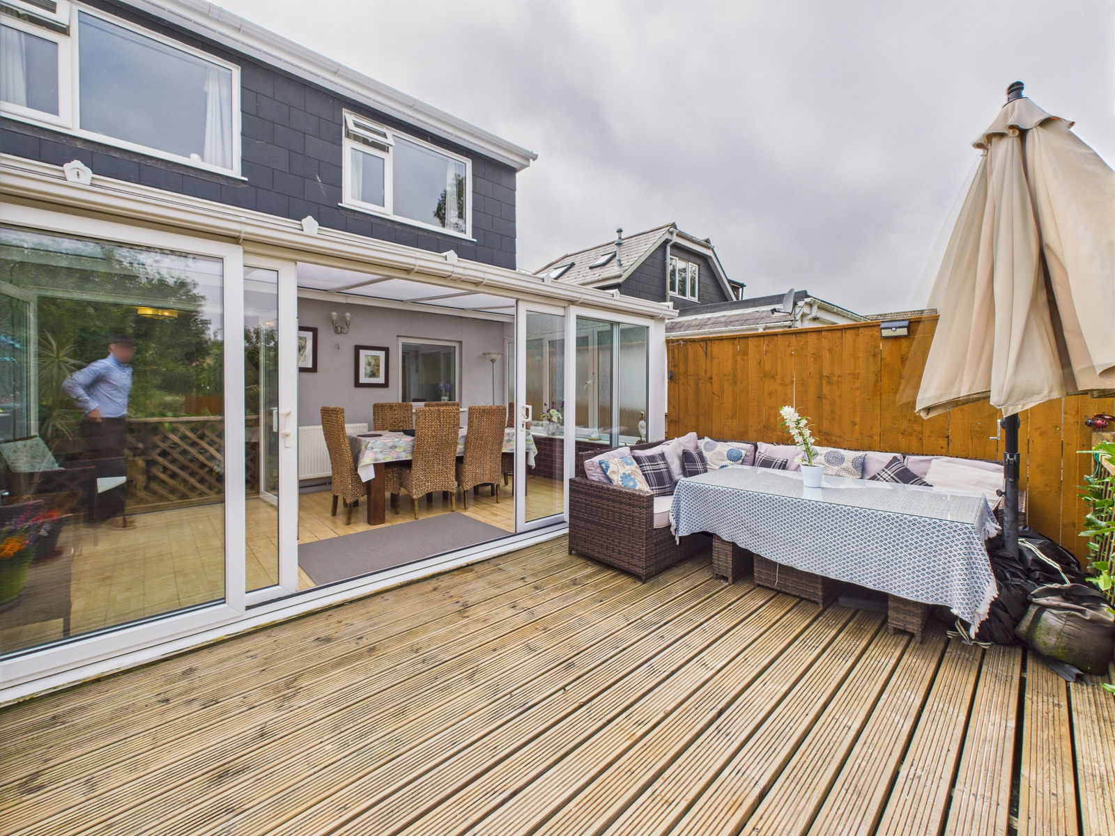 CONSERVATORY A large conservatory overlooking the sun soaked rear gardens that is currently used as a dining room but would also make a perfect further sitting room. Triple aspect uPVC double glazing and sliding patio doors that lead out to the gardens.