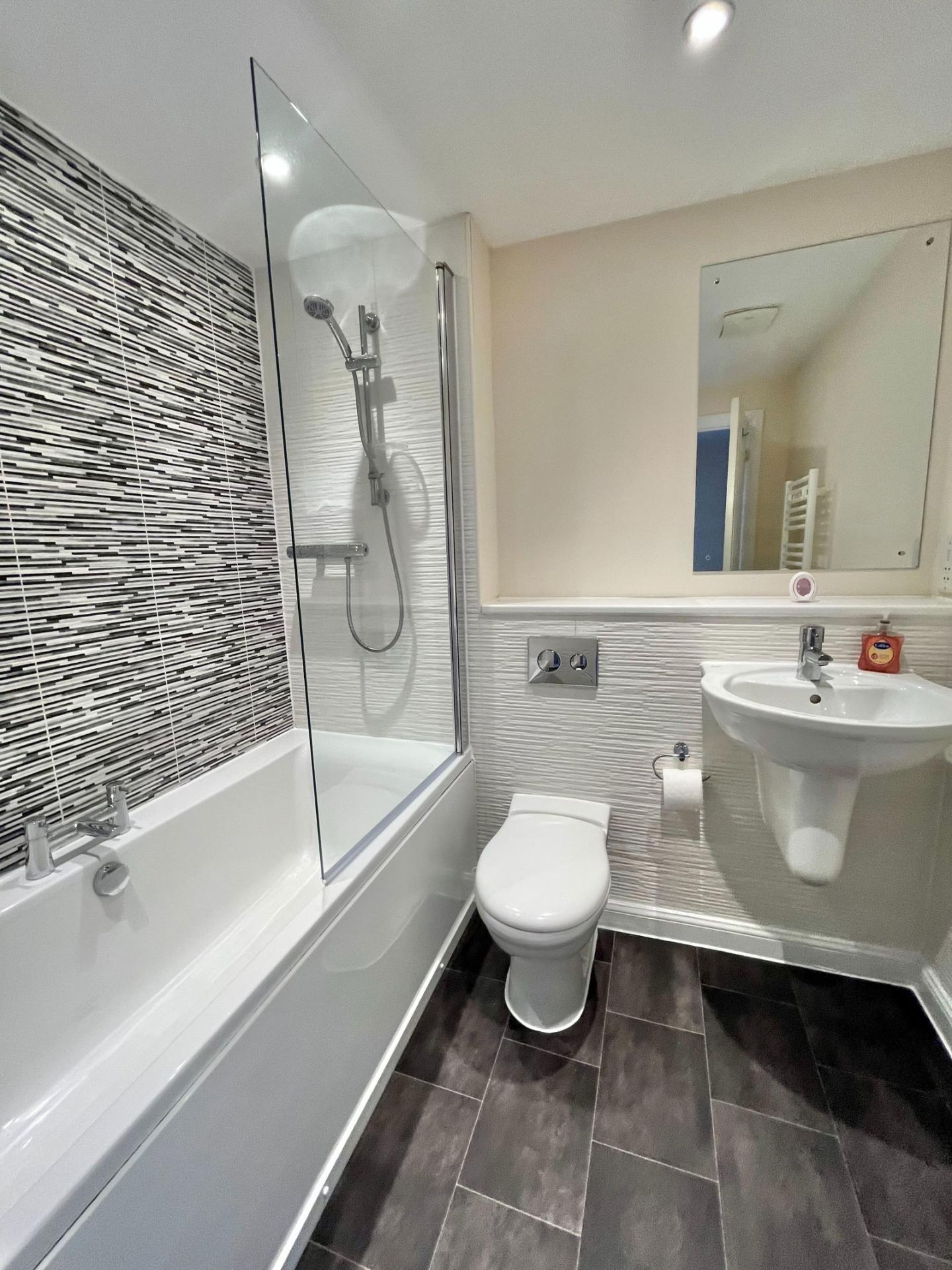 BATHROOM Contemporary bathroom. Smooth set ceiling. Inset ceiling spotlights. Panel enclosed bath with central mixer tap over. Thermostat shower with splash screen door. Low level W.C with concealed cistern and push button flush. Wall mounted wash hand basin with mixer tap over. Tiled wall areas. Wall mounted heated ladder towel rail. Two shaver points.