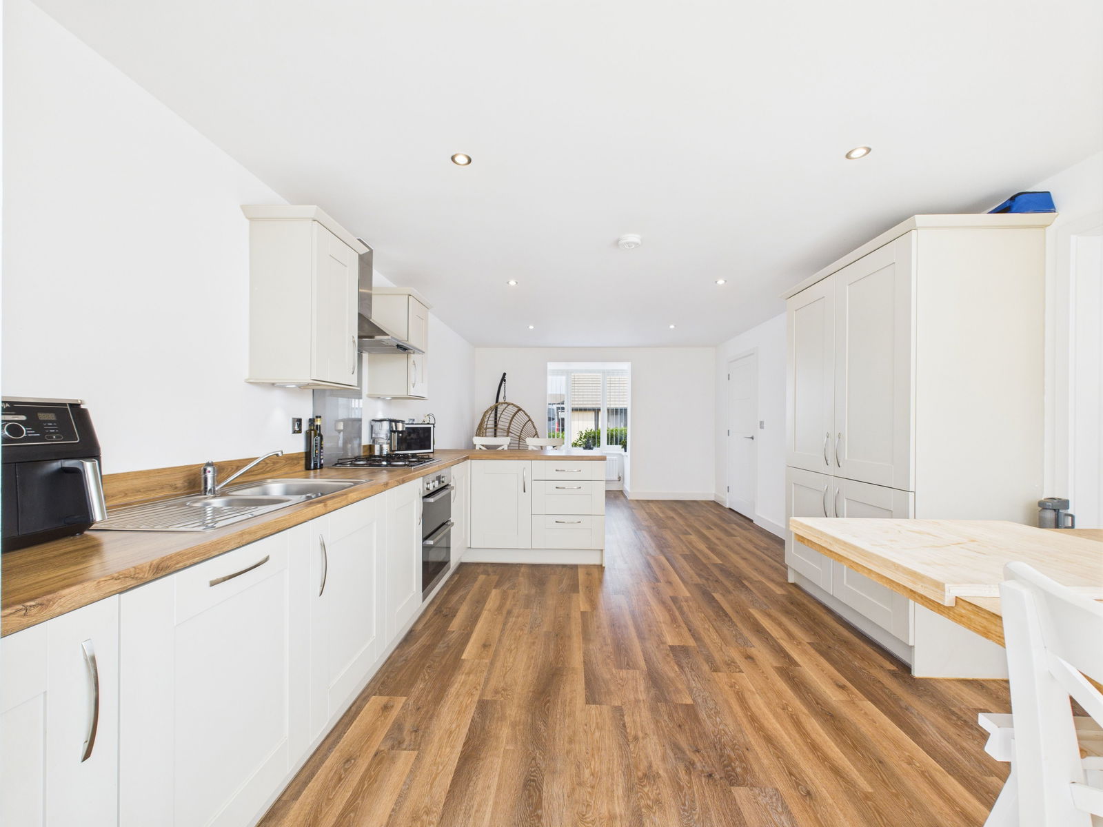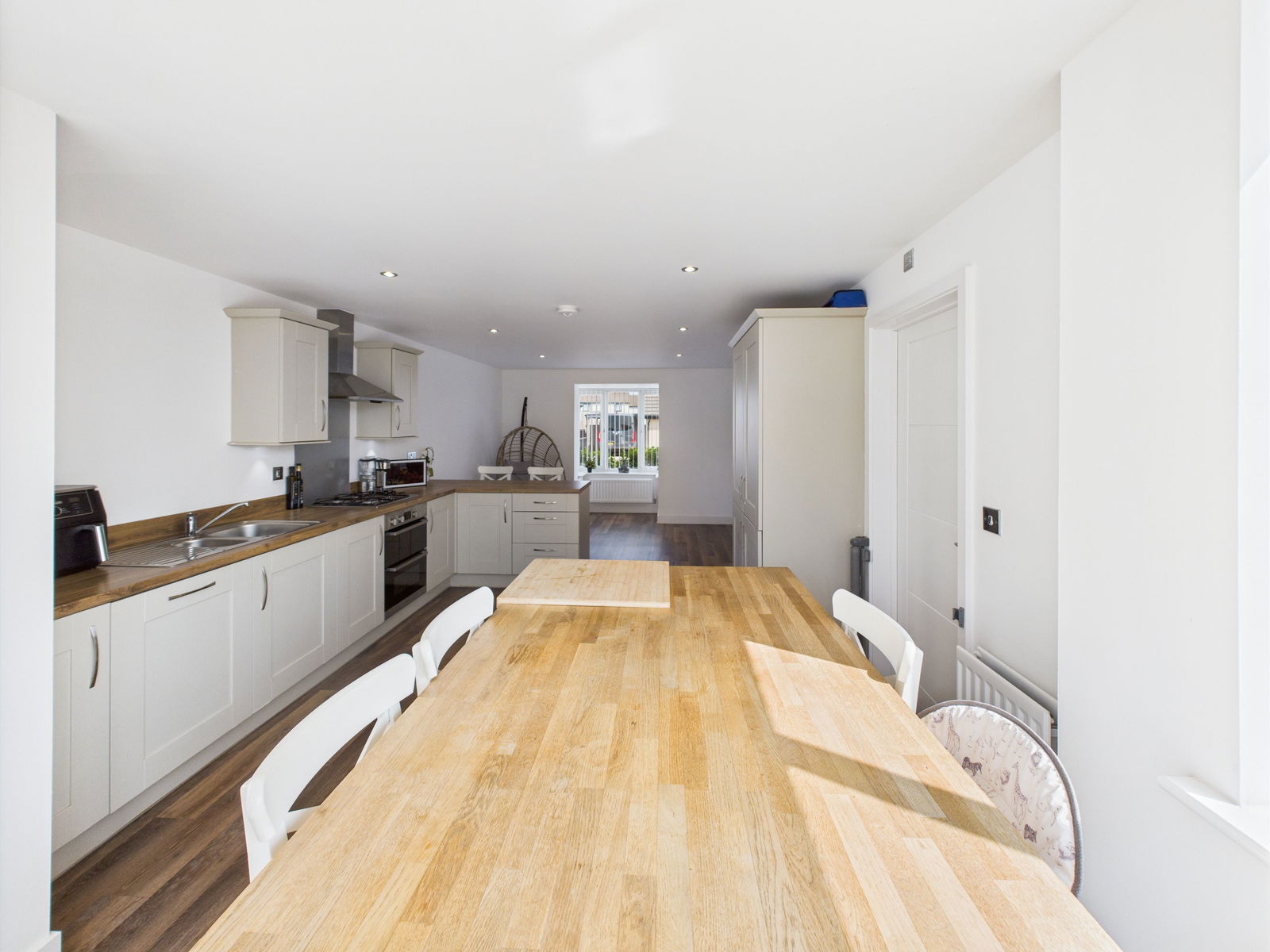 KITCHEN / DINING ROOM A beautifully appointed modern kitchen/diner designed with both modern day living and practicality in mind. Fitted with an extensive range of shaker style wall, base and drawer units complemented by roll edged work surfaces. Includes a 1 1/2 bowl stainless steel sink and drainer, integrated electric double oven with grill, four ring gas hob with extractor hood, dishwasher, and fridge freezer. A deep fitted larder cupboard offers excellent storage. The dining area easily accommodates a 6 8 seater table, with a bay window to the front and French doors leading seamlessly to the garden. Two gas central heated radiators and a door leading into:-