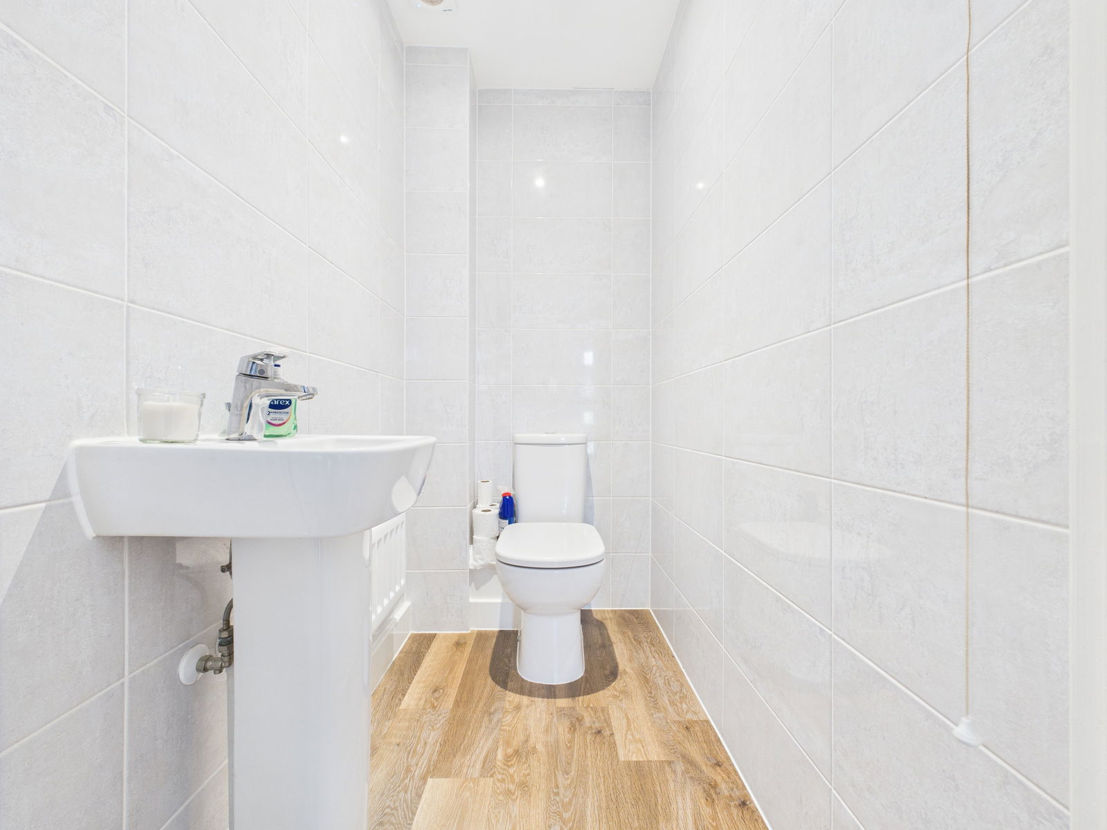 CLOAKROOM A contemporary and convenient downstairs cloakroom fitted with a low level flush WC, pedestal wash basin, tiled walls, extractor fan and a gas central heated radiator.