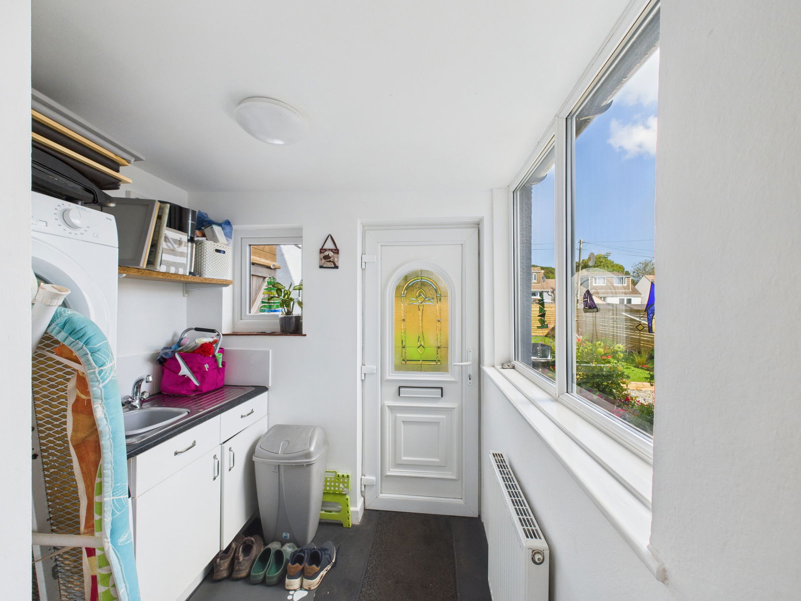 UTILITY ROOM A generously sized utility room offering practical additional storage and workspace. Includes base units with roll edged work surfaces above, a single bowl sink, space and plumbing for a stacked washer and dryer, uPVC double glazed window, rear access via a uPVC door and a gas central heated radiator.