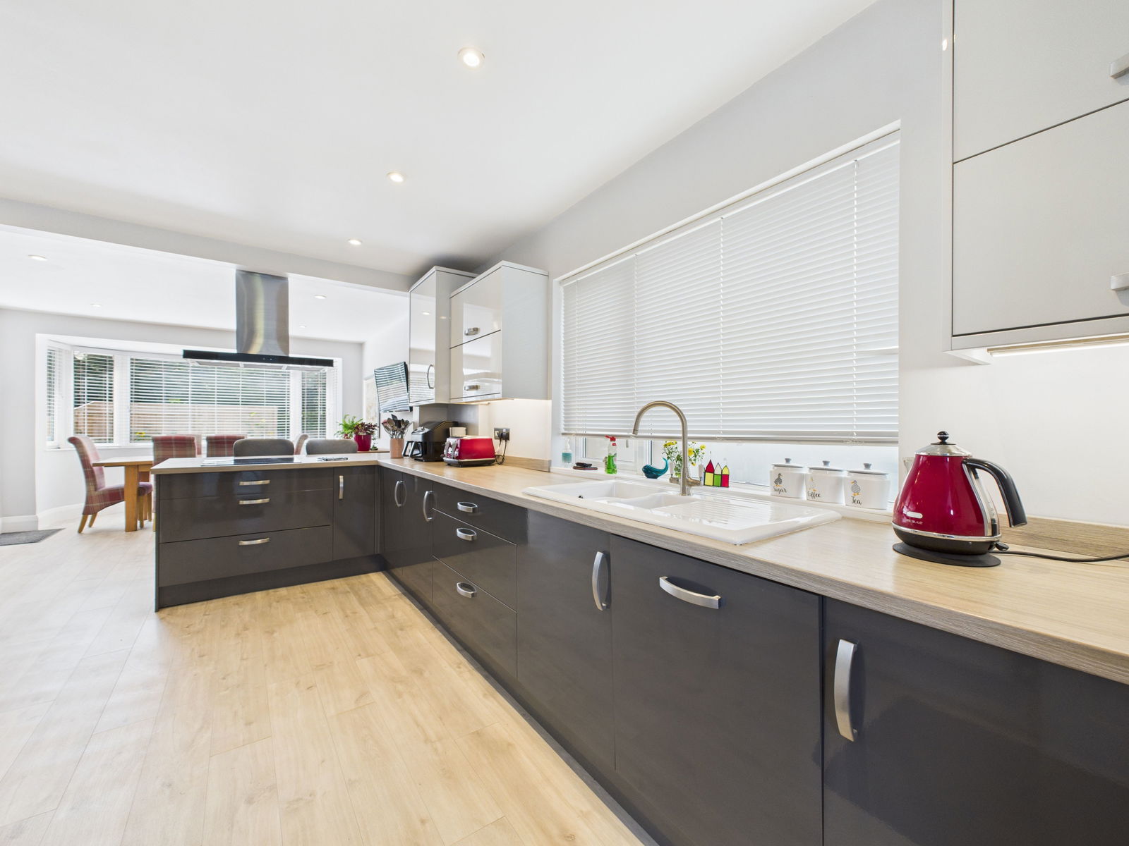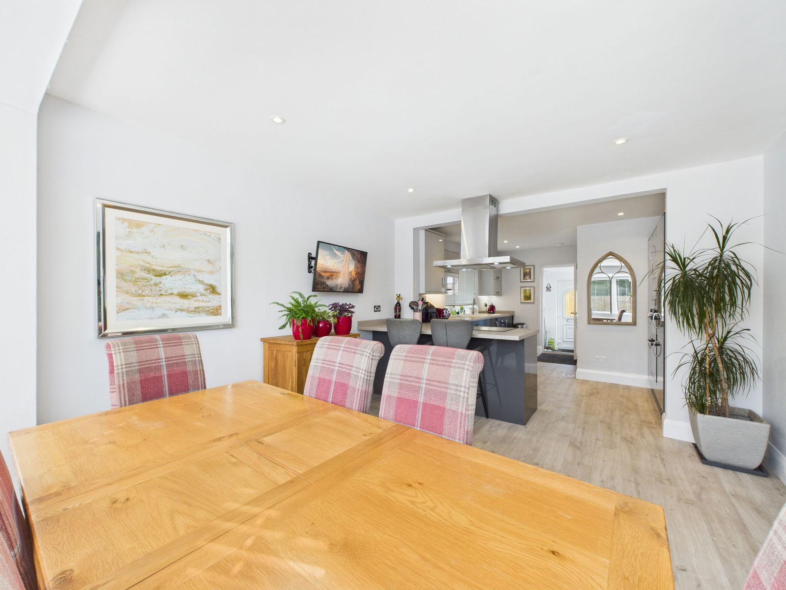 KITCHEN / DINING ROOM An expansive, light filled open plan kitchen and dining area, ideal for modern family living and entertaining. The kitchen is fitted with a comprehensive range of wall, base and drawer units with roll edged worktops, a 1 1/2 bowl ceramic sink with drainer, an integrated eye level electric double oven with grill, a four ring induction hob with extractor hood, integrated full height fridge and freezer and a built in dishwasher. Integrated microwave and a Worcester combination boiler concealed in the cupboard providing heating and hot water. Additional features include breakfast bar seating for three, space for an 8 seater dining table, dual aspect uPVC double glazed windows including a bay to the front and further window to the side, and a gas central heated radiator.