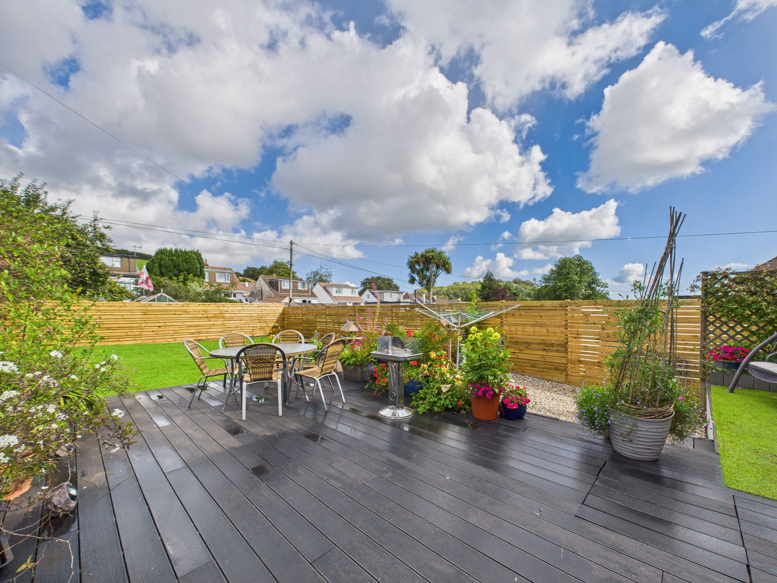 OUTSIDE The rear garden has been thoughtfully landscaped to create a tranquil and functional outdoor space. A large composite decked terrace is ideal for alfresco dining and entertaining, while a pebble stone section and spacious lawn are surrounded by an array of mature shrubs and plants. The garden also features side access, an outdoor water tap, and a gate leading to a secure carport and garage. To the front, a resin bound driveway provides off road parking for up to four vehicles.