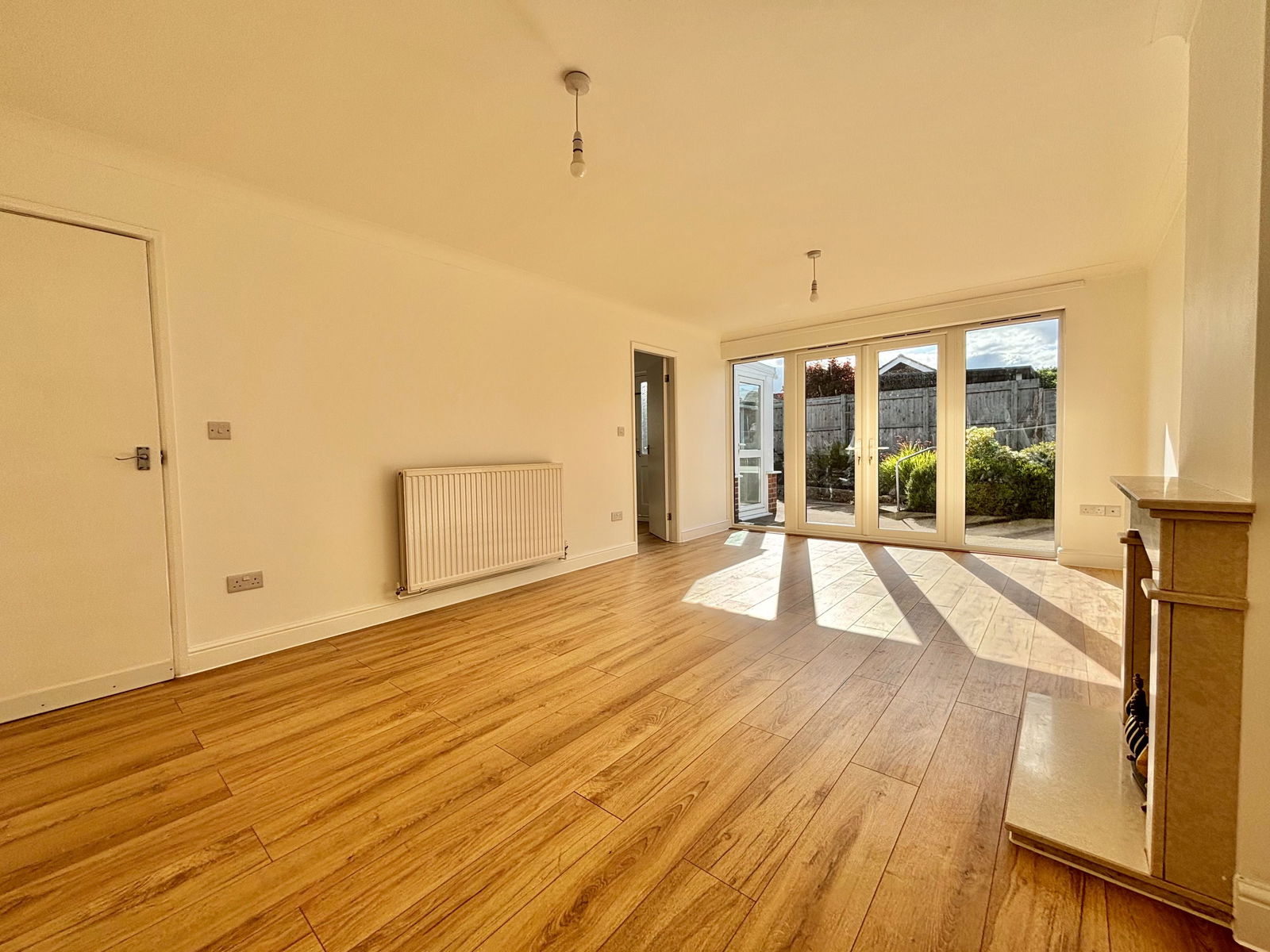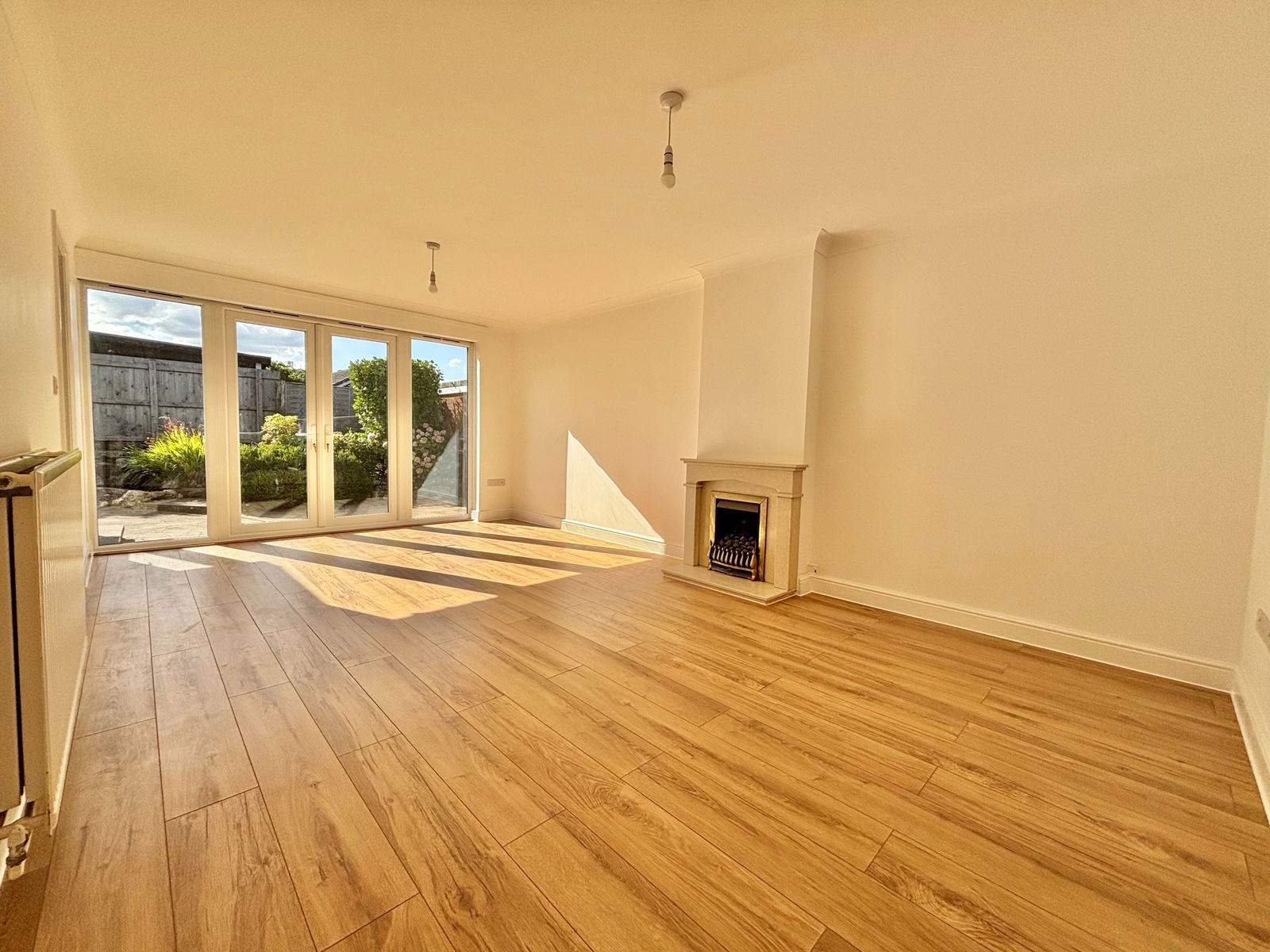 LOUNGE/DINER 19' 4" x 11' 5" (5.9m x 3.5m) An impressively light and spacious open plan lounge/diner, beautifully lit by full length side windows and uPVC double glazed French doors that lead directly to the rear garden. The room boasts a gas fireplace with a marble surround and offers ample space for both relaxing and dining. Includes a TV point and a gas central heated radiator.