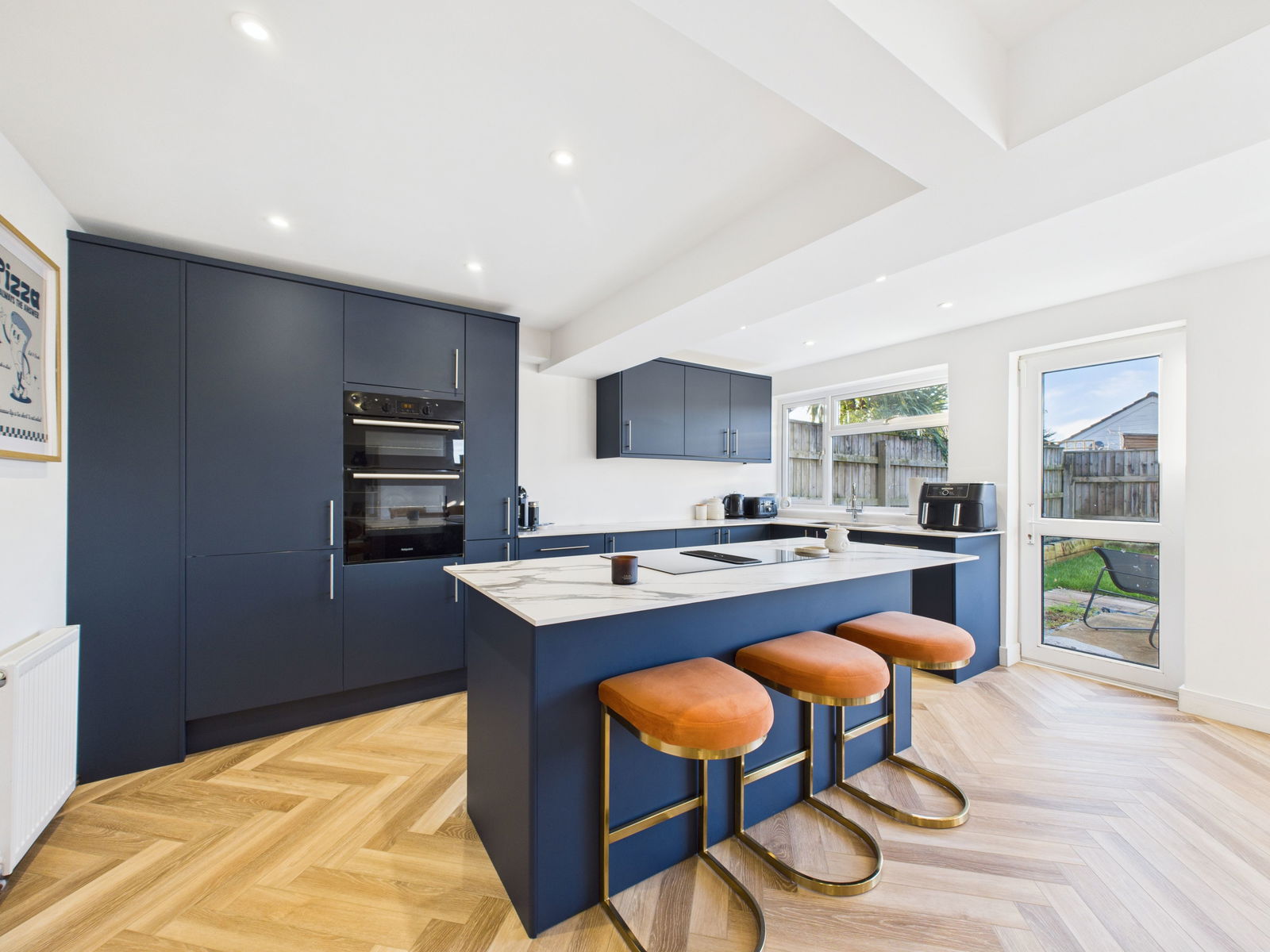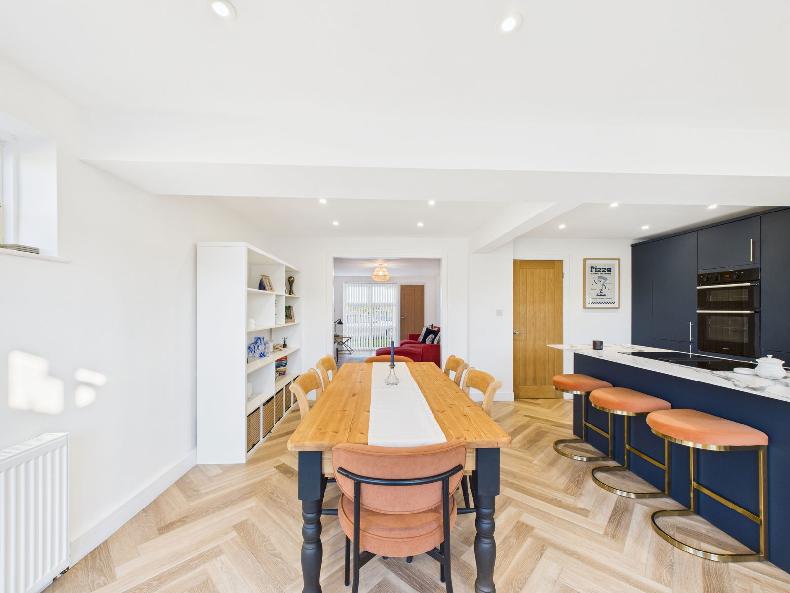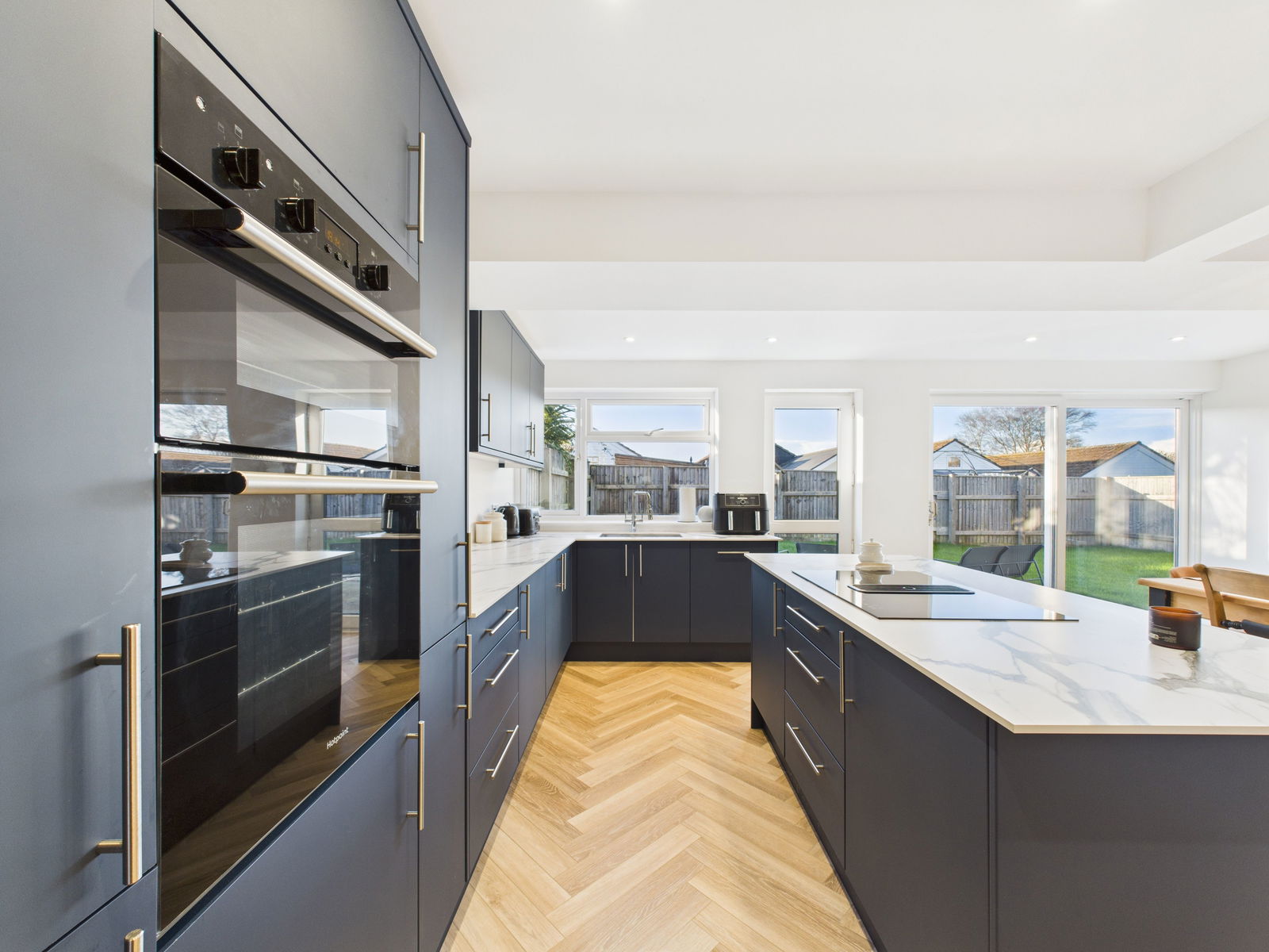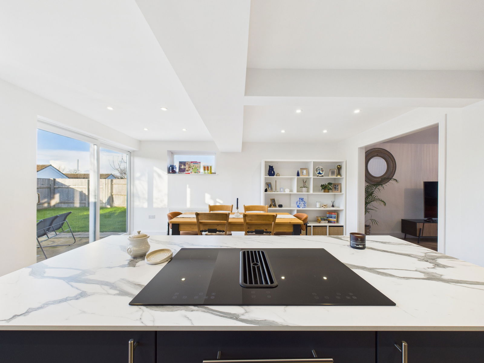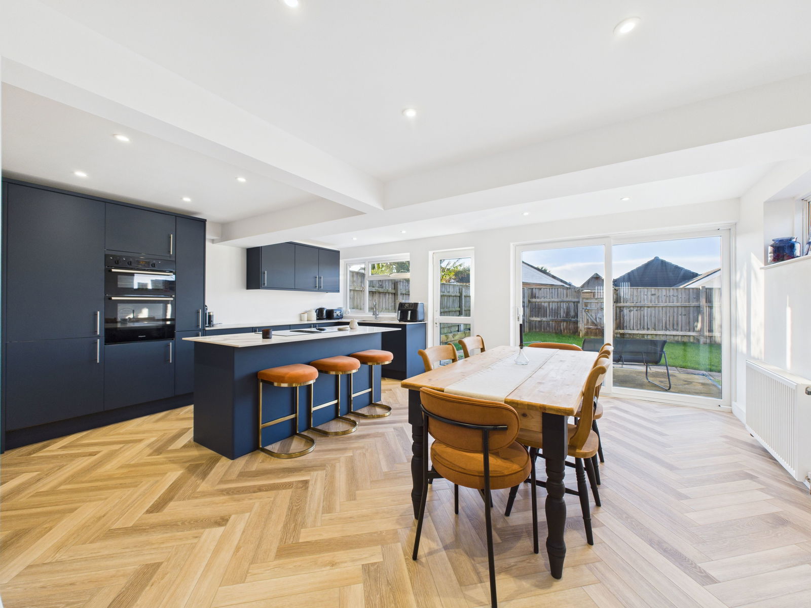 KITCHEN/DINER An exceptionally generous and light filled kitchen/dining space fitted with an extensive range of wall, base and drawer units topped with compact work surfaces. Features include a 1½ bowl stainless steel sink unit, integrated eye level electric double oven with grill, four ring induction hob, integrated dishwasher, fridge freezer, and built in bin storage. The impressive central island offers casual breakfast bar seating, complementing the ample space for an 8 seater dining table. Dual aspect uPVC double glazing including sliding patio doors opening to the garden and an additional door and window. Two gas central heating radiators.