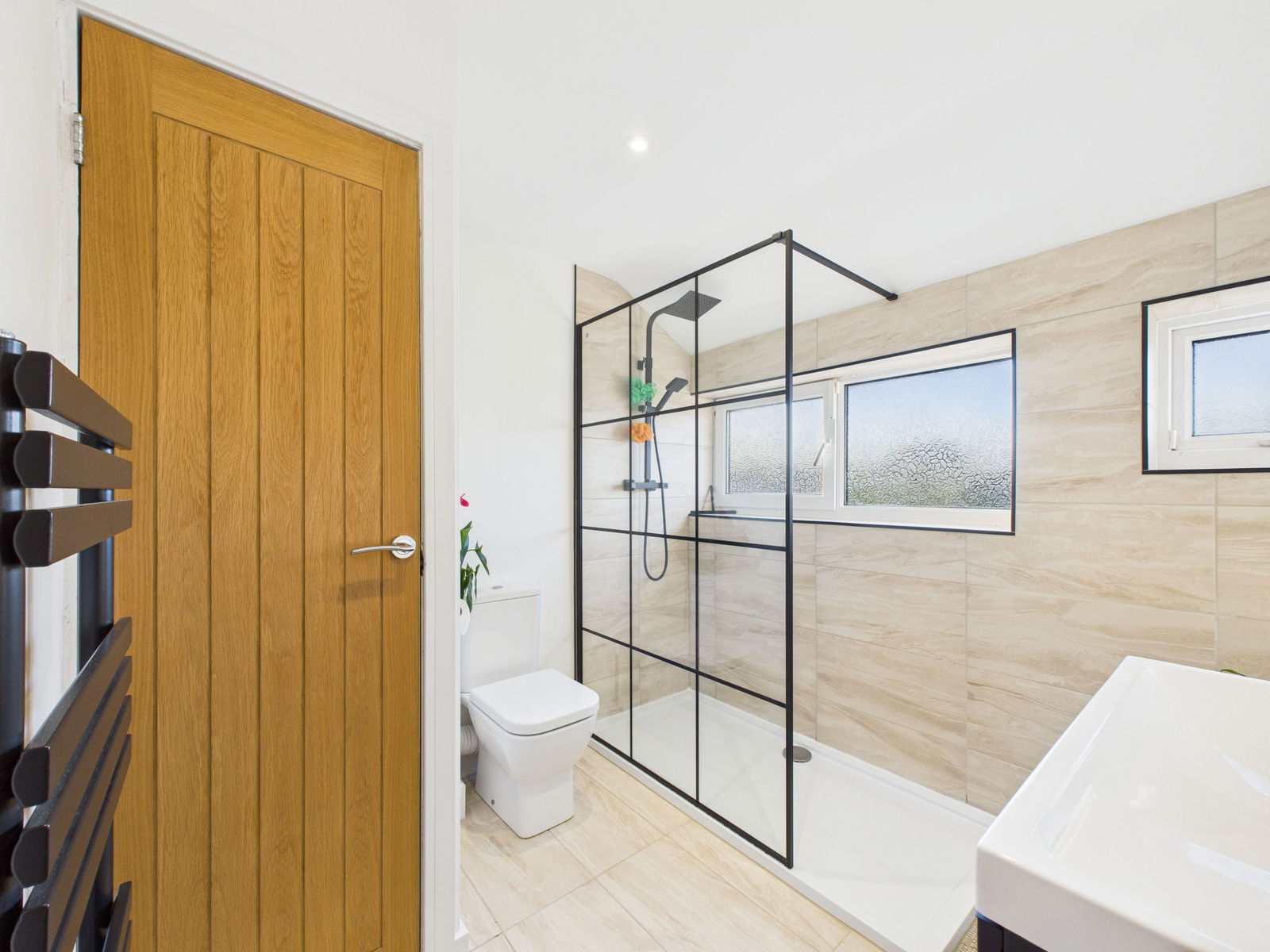SHOWER ROOM A stylish, modern shower room featuring a low level flush WC, vanity wash basin with storage below, and a walk in shower. Finished with contemporary tiling, a deep airing cupboard housing the combination boiler, uPVC obscure double glazed window, and a black heated towel rail.