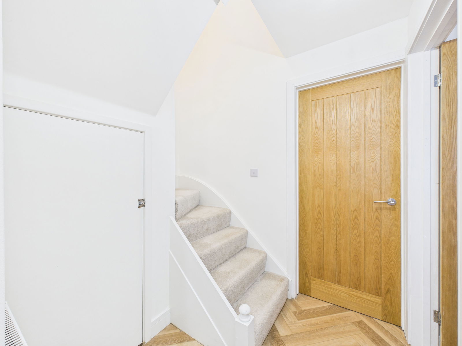 CLOAKROOM A contemporary ground floor cloakroom comprising a low level flush WC, wall mounted wash basin with built in storage, a stylish black heated towel rail and complementary modern tiling.